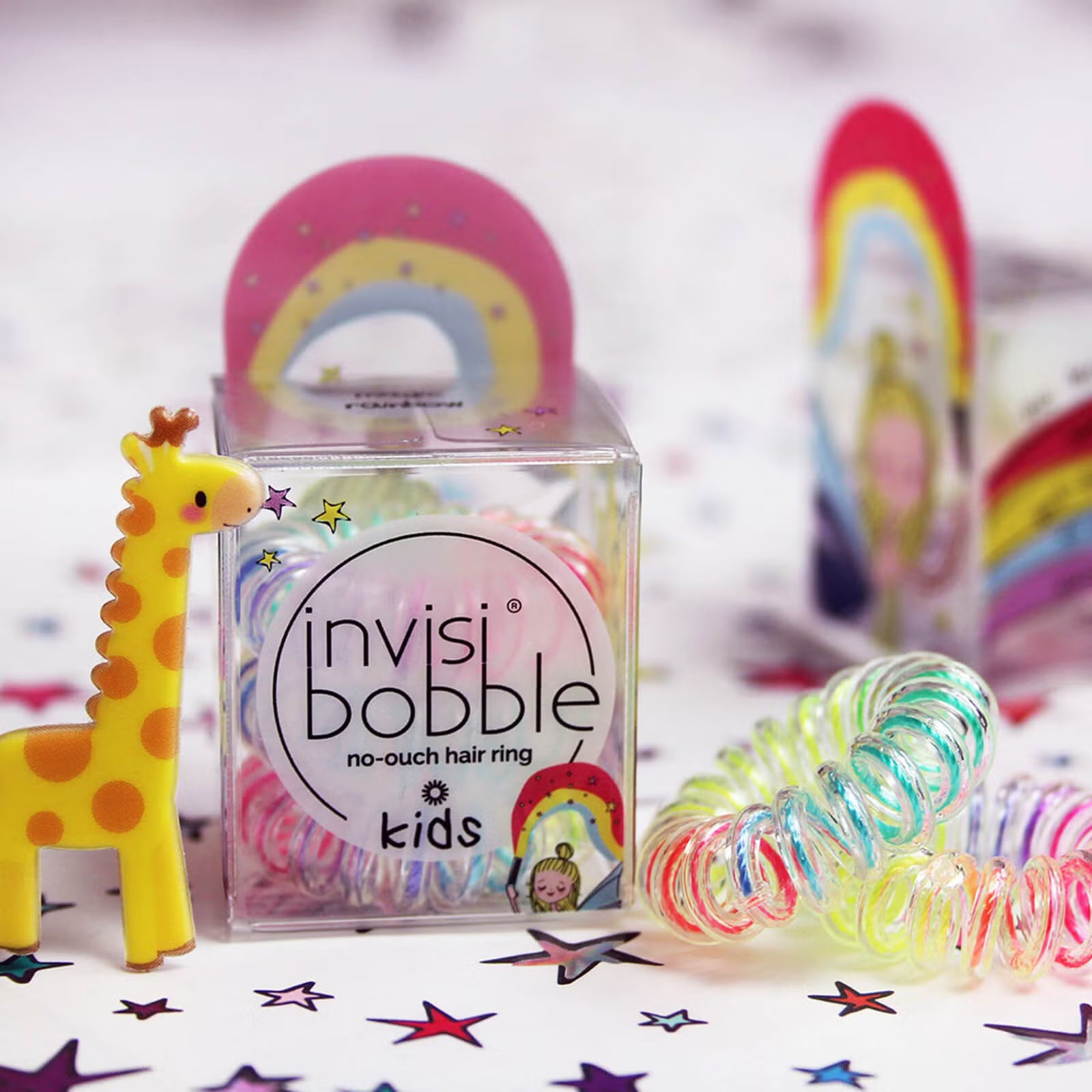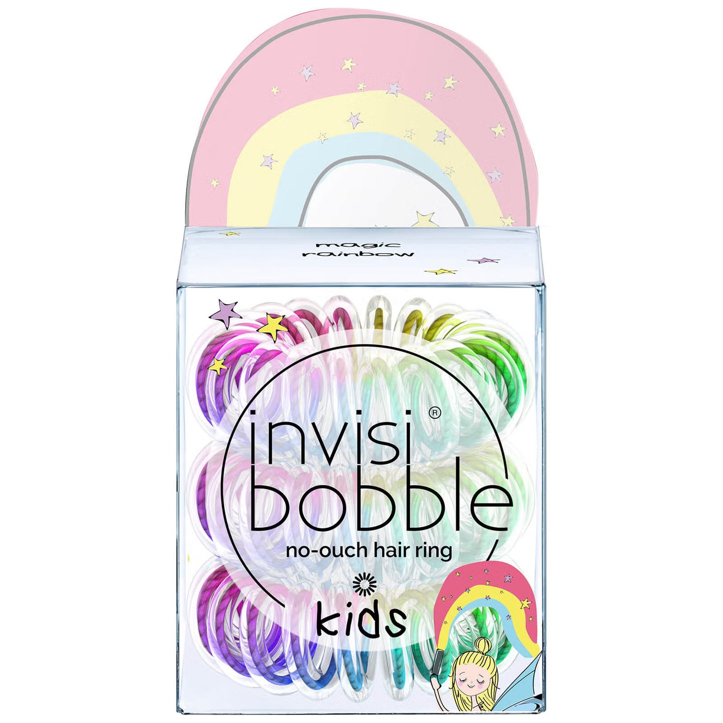 Create space buns or cute braids with the Kids' invisibobble Hair Tie in 'Magic Rainbow'