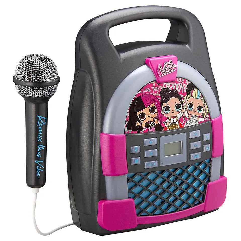 The new LOL SURPRISE Bluetooth portable MP3 karaoke machine player with light show is here! Put on a show And sing to whatever you like. Store hours of music (100S of songs) with built-in memory. Stream unlimited audio via Bluetooth so you can play and sing along to whichever songs or audio content you like. You can even plug in a USB drive to the USB port to add even more songs or content. Sing like a Star with the real working wired microphone and use the multi colored LED lights to put on a light show. Not only can you store music but you can also store audio books, stories, and more. The built in rechargeable batteries will ensure endless hours of fun (USB charging cable included). the storage compartment in the back allows you to store your charging cable and keep your USB protected. The lightweight and portable design allows you to take your karaoke machine anywhere inside, outside, in the car, or traveling in general. This will make the perfect gift or birthday present for your little one! Features: Bluetooth streaming, built-in memory, USB portrayal, working wired mic, party light show, lightweight and portable, built-in rechargeable batteries, charging cable included, LOL style Perfect gift ages 3 and up order now!!