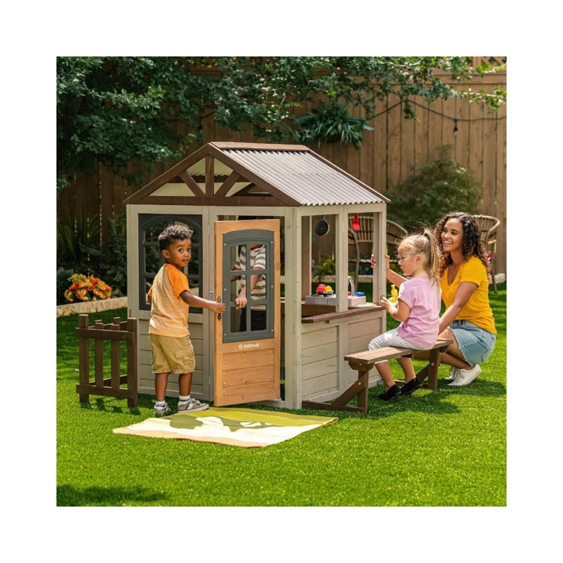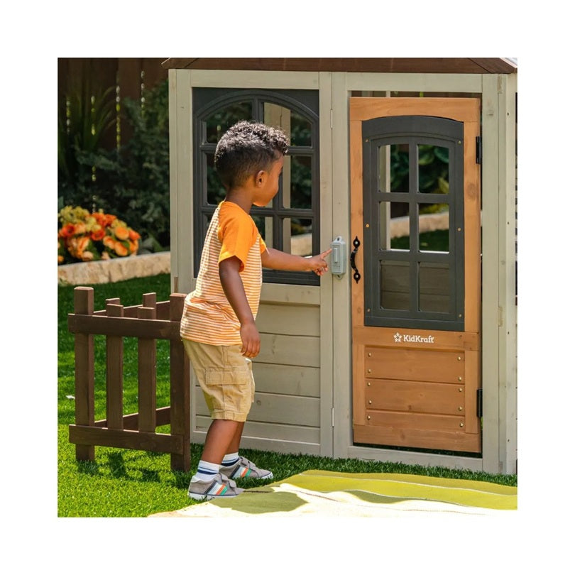 • Unleash endless outdoor adventures with the KidKraft Pioneer Cottage Playhouse! This charming wooden playhouse combines rustic design with engaging interactive features to create a delightful and cozy retreat for kids. From the moment they step through the picket-fence yard and ring the working doorbell, children will feel right at home. Inside, the spacious playhouse offers plenty of room for imaginative play, enhanced by breezy windows that keep the interior light and airy. The built-in cooktop and sink, paired with 13 kitchen accessories including play food, inspire hours of role-play fun. The serving window with an attached bench is perfect for hosting pretend meals or snacks for friends and family. A thoughtful pet door invites furry friends (or adventurous kids!) to join in the fun, making this playhouse a hub for creative exploration and bonding.