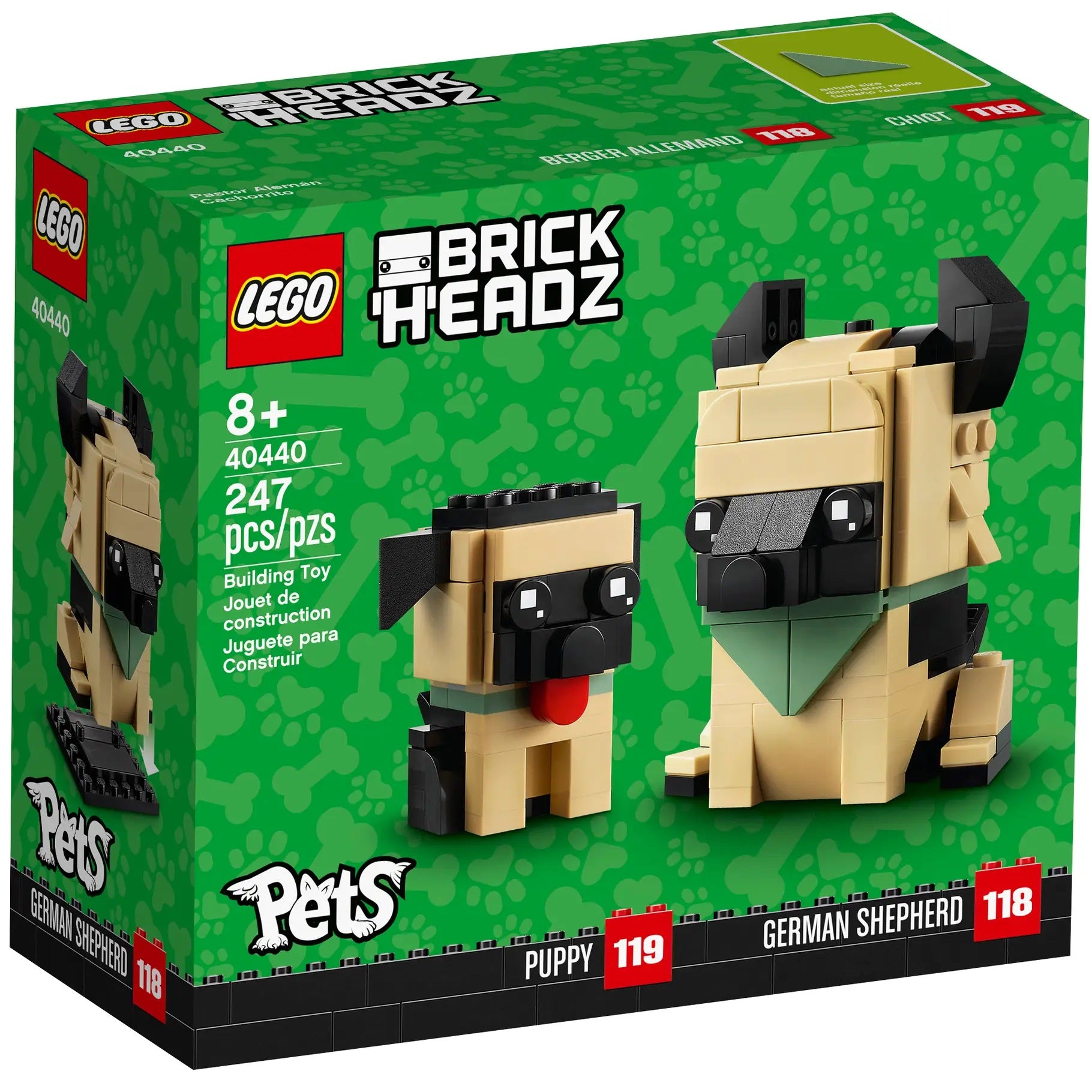 Collectible construction set featuring fun LEGO® BrickHeadz™ models of a German shepherd dog and a puppy sitting together in a basket.