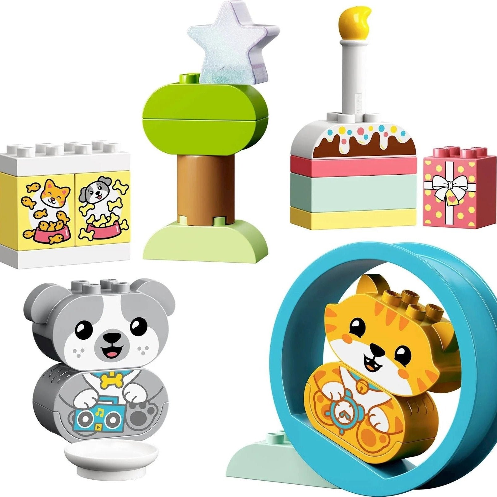 The My First Puppy & Kitten With Sounds set features buildable models of a puppy and kitten, complete with interactive sound elements. This set includes various parts for creating the animals, along with sound effects for a more engaging play experience. Builders can enjoy assembling and interacting with these adorable pets. Ideal for young builders and animal lovers, this set provides a fun and interactive building experience.