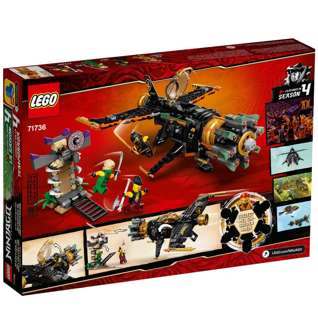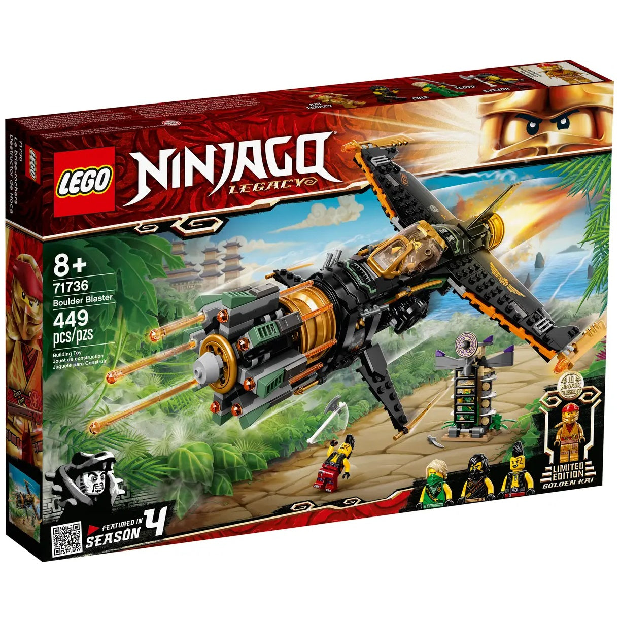 - LEGO® NINJAGO® Boulder Blaster (71736) هي مجموعة لعب Legacy مطورة وحديثة تتميز بطائرة إطلاق نار رائعة للغاية وسجن نينجا لمنح الأطفال تجربة لعب مليئة بالإثارة.