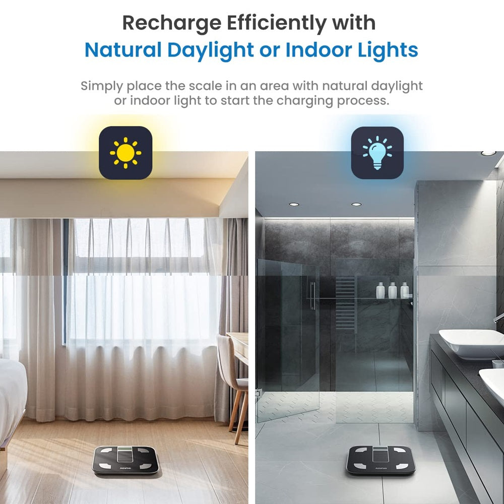 Renpho solar scale for body weight with newly designed light energy tech, charged through daylighting or artificial lights. You will save at least $16 per year on replacing batteries and do some contribution to the environment by using this battery-free Renpho scale instead of using disposable battery powered scales.