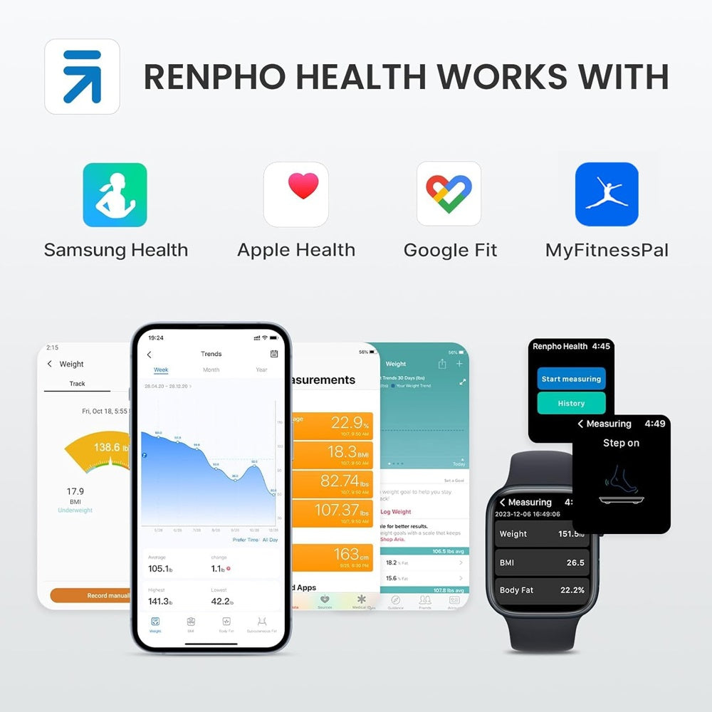 Renpho smart body scale loss weight bluetooth APP works with Samsung Health, Fitbit, Google Fit, and Apple Health. Download Renpho Health App at App Store or Google Play, also works with Apple Watch (Except for Apple Watch Series 1). Renpho Health App works with Bluetooth 4.0 And above.