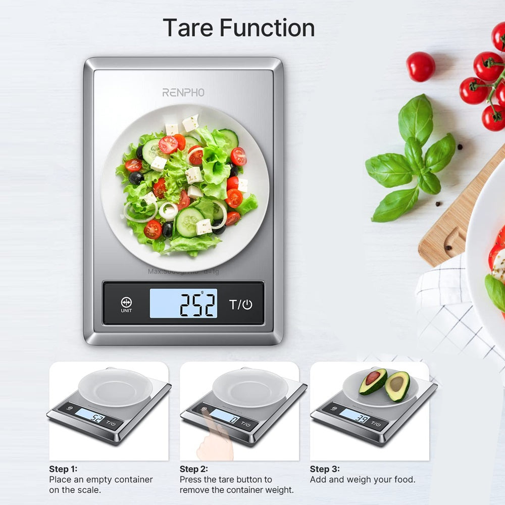 وظيفة الوزن الصافي: اضغط ببساطة على زر الوزن الصافي لخصم الوزن الموجود على الحاوية التي تحتوي على المكونات، مما يجعل من السهل الحصول على الوزن الدقيق للطعام دون تغيير الحاوية.