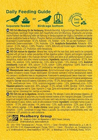 الأعلاف المعدنية. إلى جانب الغذاء الرئيسي، تحتاج الطيور إلى إمدادها باستمرار بالحصى بسبب بعض خصائص الجهاز الهضمي. تساعد المكونات العضوية وغير العضوية على طحن البذور الصلبة في المعدة العضلية للطيور وتعمل كمصدر إضافي للكالسيوم والفوسفور والصوديوم وغيرها من المواد المعدنية. يعتبر الكوكينة عبارة عن صدفة بحرية مطحونة وتمثل مصدرًا مهمًا للكالسيوم والفوسفور والصوديوم والمعادن الأخرى. يذوب الكوكينة في البيئة الحمضية للمعدة؛ يمكن امتصاص الأملاح المعدنية الناتجة بسهولة في جسم الطائر. يعد الكوكينة ضروريًا بشكل خاص خلال فترة التعشيش لبناء قشور البيض القوية وكذلك للحفاظ على صحة العظام والمنقار في الكتاكيت والطيور البالغة. يتم الحصول على الحجر الجيري عن طريق طحن وتجفيف معدن الكالسيت. الحجر الجيري غني بالمواد التي تدعم توازن الماء والملح وتؤدي إلى نمو أفضل لأنسجة العظام. يضمن الحجر الجيري الأحمر الأداء السليم للجهاز الهضمي لدى الطيور. يؤدي الاستهلاك المنتظم للحجر الجيري الأحمر إلى فضلات أكثر صلابة. الطين الكمبري المطحون ضروري لإزالة المواد السامة التي يمكن أن تتراكم في جسم الطائر. علاوة على ذلك، يحتوي الطين على معادن ومواد عضوية وأكاسيد الحديد ومغذيات مفيدة أخرى. تحتوي قشور جوز الأرز المبشورة على مجموعة متنوعة من المغذيات الدقيقة والكبيرة. علاوة على ذلك، تمتلك القشرة نشاطًا ماصًا؛ فقد أظهرت تأثيرًا قابضًا ومضادًا للميكروبات ومضادًا للالتهابات. ينظم الفحم الخشبي مستوى الحموضة في معدة الطيور؛ يساعد استهلاكه في الوقاية من أمراض الجهاز الهضمي. نظرًا لمساميته العالية، فإن الفحم قادر على إزالة المواد السامة من الجسم.