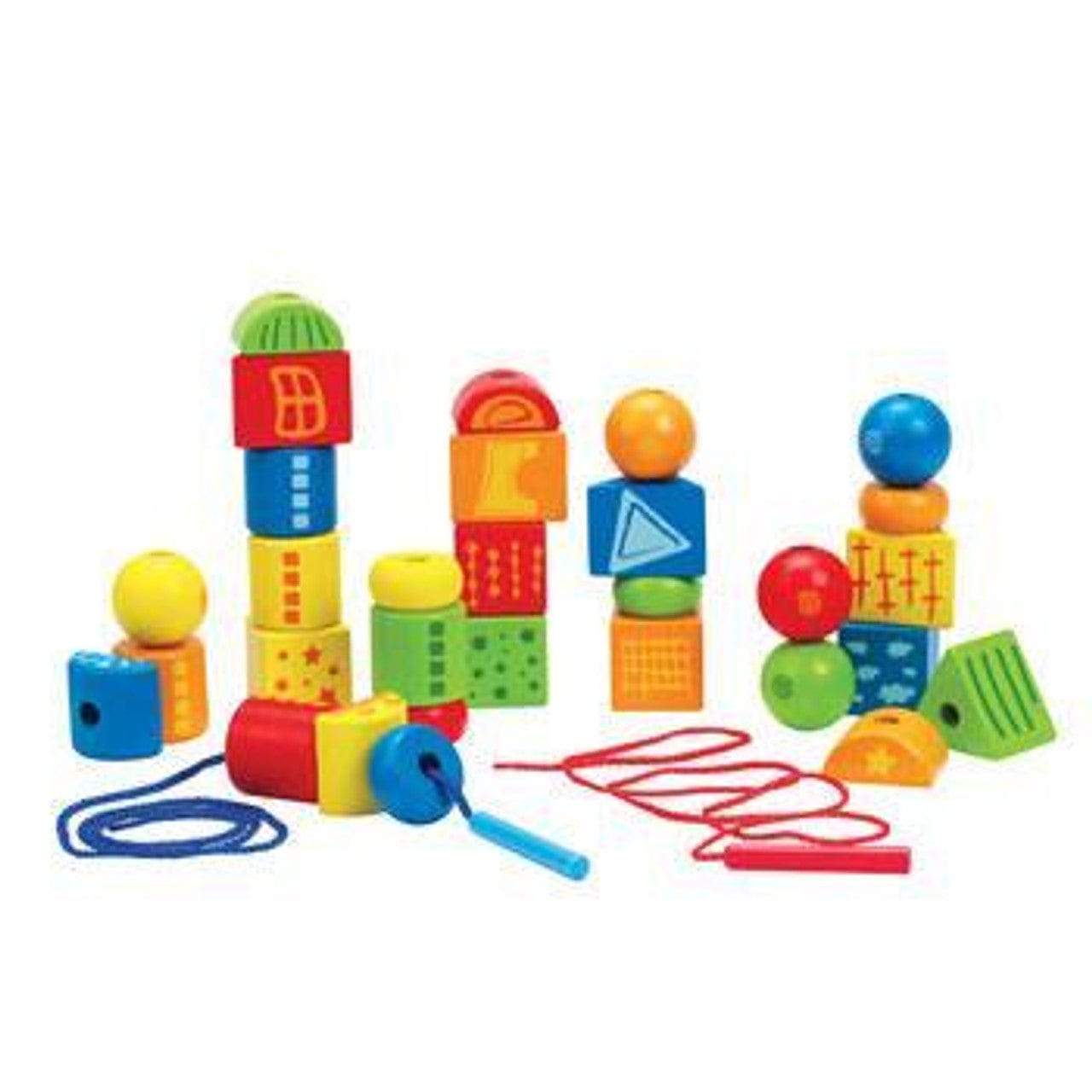 مجموعة متنوعة من الأشكال: تتضمن مجموعة String-Along Shapes مجموعة متنوعة من الأشكال الخشبية الملونة، مثل الدوائر والمربعات والمثلثات والنجوم والمزيد. يأتي كل شكل مع فتحة للربط.