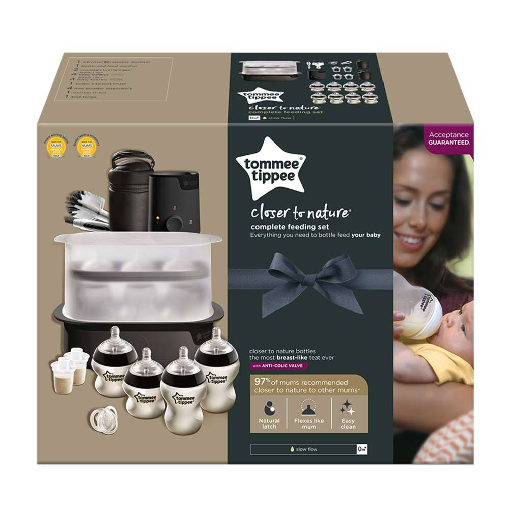 تحتوي مجموعة التغذية الكاملة من تومي تيبي على كل ما تحتاجينه لإطعام طفلك بسهولة وأمان. يقوم معقم الزجاجات الكهربائي المتطور Super Steam بتعقيم 6 زجاجات في 5 دقائق فقط، باستخدام بخار طبيعي 100% لقتل الفيروسات و99.9% من البكتيريا. بدون مواد كيميائية أو بقايا. يعمل جهاز تدفئة الزجاجات والطعام من تومي تيبي على تدفئة حليب الثدي والحليب الصناعي وطعام الأطفال بسرعة وأمان. تجعل زجاجة الأطفال الحائزة على جوائز Closer to Nature® التبديل بين الرضاعة الطبيعية والزجاجة أمرًا بسيطًا، مع حلمة تشبه الثدي وسهلة الالتصاق مصممة من قبل خبراء الرضاعة الطبيعية. يساعد الصمام المضاد للمغص في منع أعراض المغص عن طريق تقليل دخول الهواء. تناسب موزعات مسحوق الحليب الخاصة بنا زجاجة الرضاعة سعة 260 مل، وتتسع لما يصل إلى 8 ملاعق للرضاعة أثناء التنقل. أكياس زجاجات معزولة للزجاجات الساخنة والباردة، مثالية لأي طقس. *تم اختباره ضد إنفلونزا H1N1 (EN 16777). **