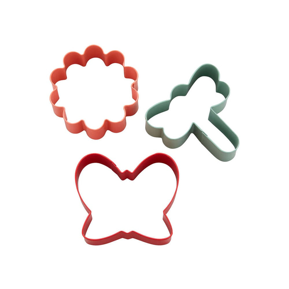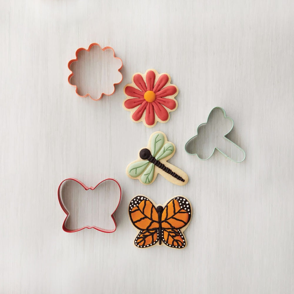 - 3 قوالب بسكويت بثلاثة تصاميم: زهرة الأقحوان، فراشة، ويعسوب.