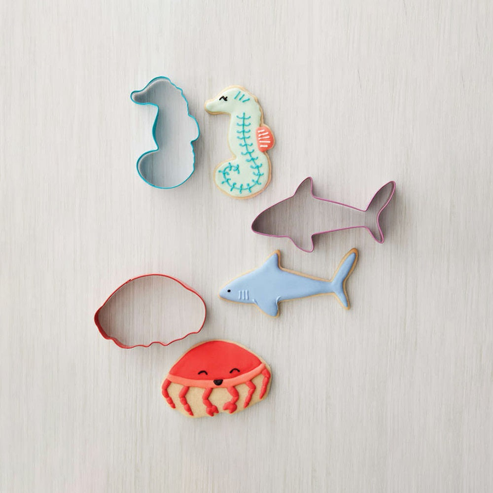 - 3 قوالب بسكويت بثلاثة تصاميم: حصان البحر، وسمكة قرش، وقنديل البحر.