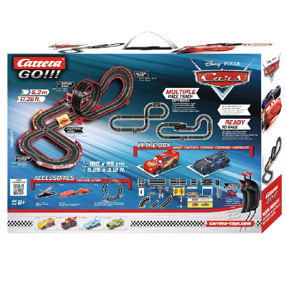 You can enjoy spectacular races on this Carrera GO!!! race track both during the day and at night. In the dark, however, the cool underglow lighting on these two cars comes into its own even more so. On the 5.3-metre-long race track on a scale of 1:43, the two opponents don’t give each other an inch. The route takes drivers through a loop, a fly-over, a narrow section and an intersection. The slot cars on a scale of 1:43 look very similar to the original movie heroes. The set includes the two cars and the race track, two speed controllers with turbo button, a transformer, the accessories for the track and other decorative elements.