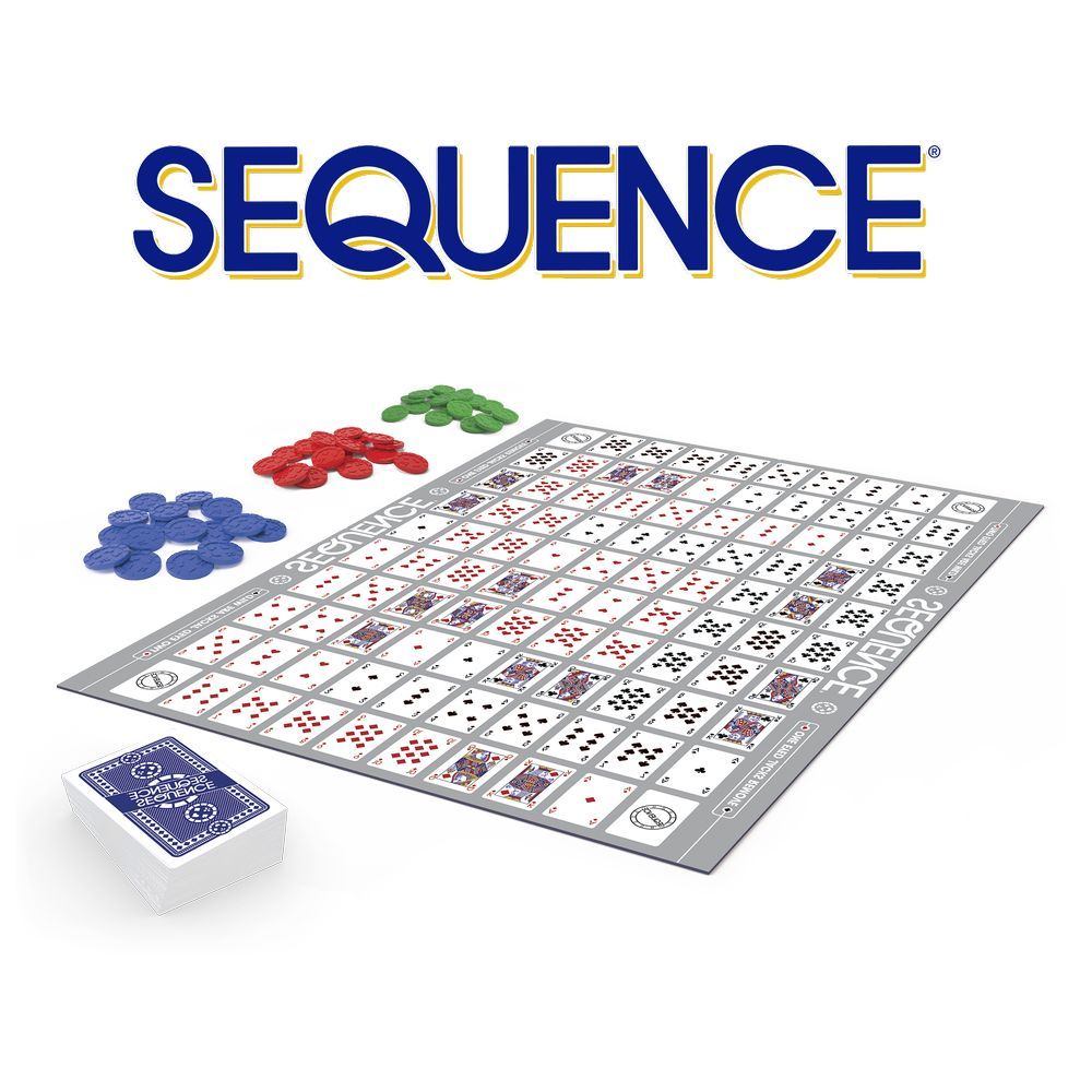 It's fun, it's challenging, it's exciting, it's SEQUENCE! Play a card from your hand, and place a chip on a corresponding space on the game board. When you have five in a row, it's a SEQUENCE. Learn to block your opponents or remove their chips, and watch out for the Jacks - they're wild! With a little strategy and luck, you'll be a winner. Includes 1 Folding Game Board, 2 Decks of SEQUENCE Playing Cards, 135 playing chips: 35 red, 50 blue and 50 green, and Complete Instructions For 2-12 players, ages 7 and up.