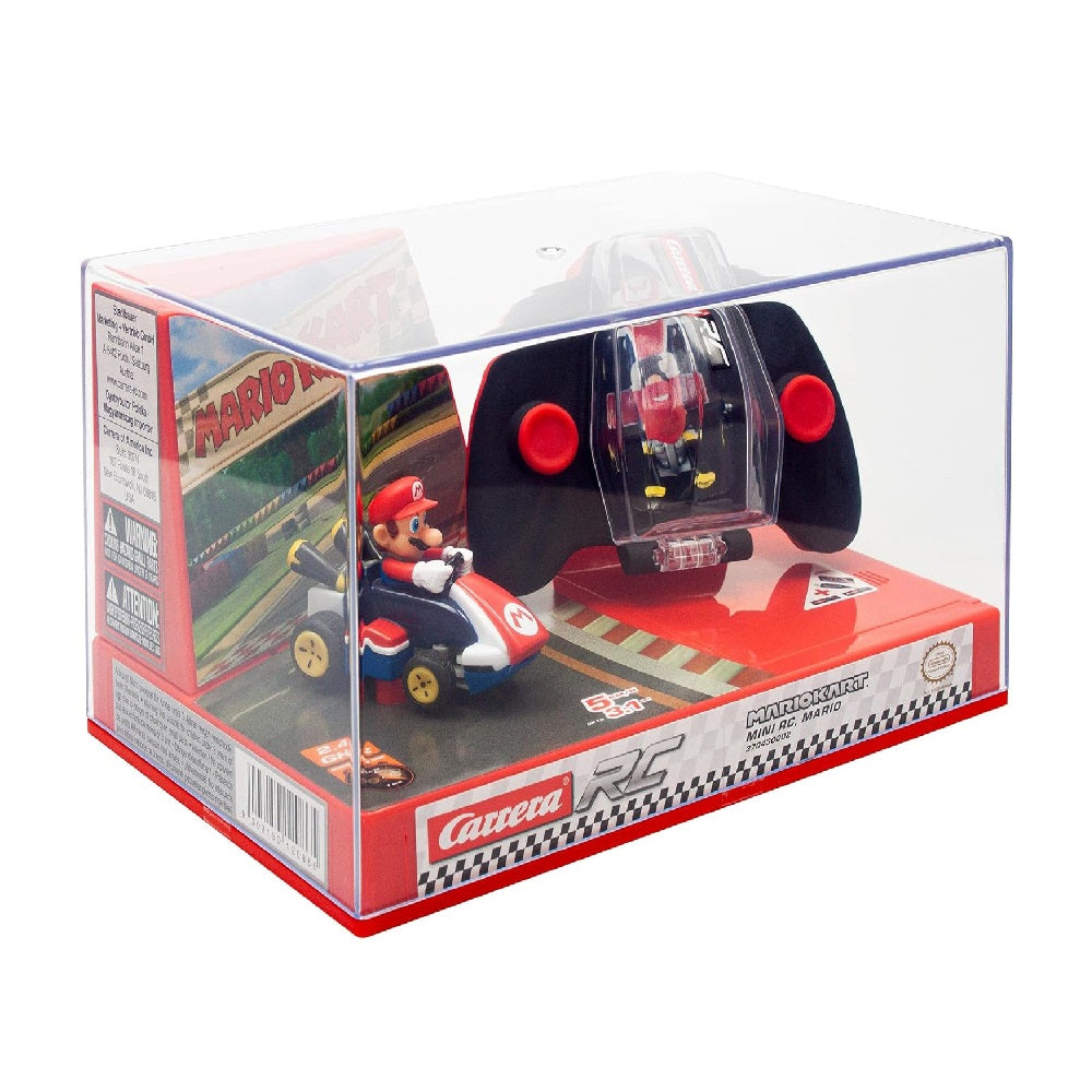 Win anytime and anywhere with Mario! Conquer every race with your own Mario Kart Mini RC! Mario’s classic red design is paired with a sleek race kart, making the racing hearts of Mario Kart fans all round the world beat faster. Set up a table-top race track and battle it out with friends! Due to his small size, mini Mario is even able to fit into a special compartment on his included controller, making him easily transportable, enabling spontaneous races with ease, or just set out a course and time yourself for the fastest lap! On your marks, get set, GO!Known the world over, Mario and his friends have been competing for many years in the virtual world, and now they’re ready to enter ours, as part of Carrera RC’s Mario Kart Mini RC series! After 20 minutes of battery charging (during which you can fine-tune your video race skills), Mario is ready for his next adventure with friends and run times of up to 7 minutes. Thanks to interference-free 2.4GHz full function radio control, up to 16 vehicles can race together, so fun with friends is limitless! It’s safe to say you’ve never played Mario Kart like this before! Rated for ages 6+, fully licensed and approved by Nintendo, each mini kart measures a compact but perfectly formed 6.2cm long and can reach speeds up to 5 km/h. A must-have for fans of the cult video game, and with a total of six speedy mini RC racers available, you can pick your favourites and start your collection today! And, with all batteries included, everything you need is in the box!NOTE: This product is not suited to very smooth surfaces. Before driving, ensure tyres are properly located on wheels.