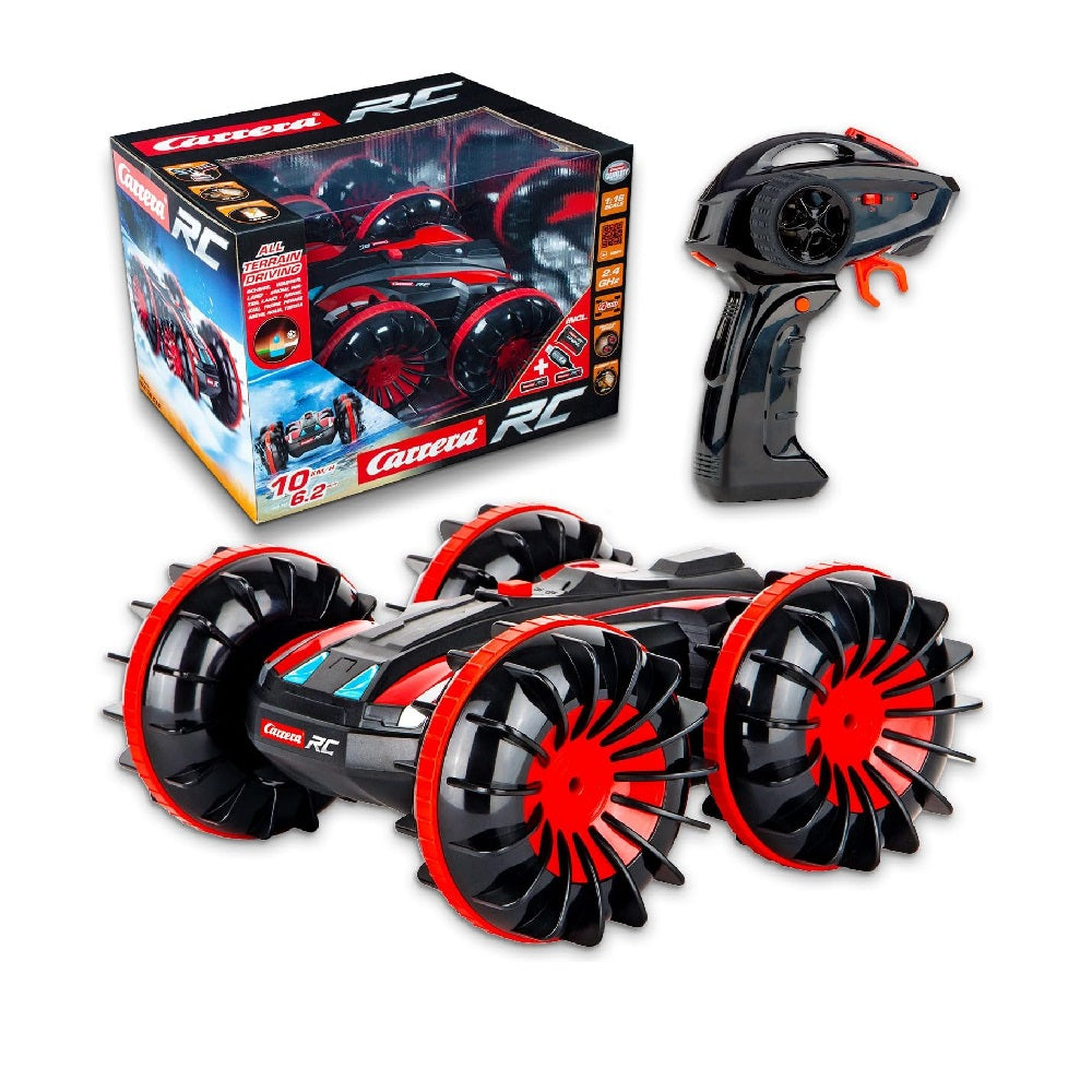 Water, snow and land: This all-rounder cuts a fine figure on any terrain! The Carrera RC All-Terrain Stunt Car with its extra-large paddle-wheel-style tyres moves through any terrain and over deep segments. The terrain artist is protected against penetrating moisture and guarantees long playtime fun, even at the pool. Even stunts are possible with this robust vehicle: the outdoor miracle can effortlessly create a rapid rollover. The persevering speedster can shine with a top speed of just over 6 mph. The All-Terrain Stunt Car comes with a 6.4V 700mAh LiFePo4 battery and USB charging cable.