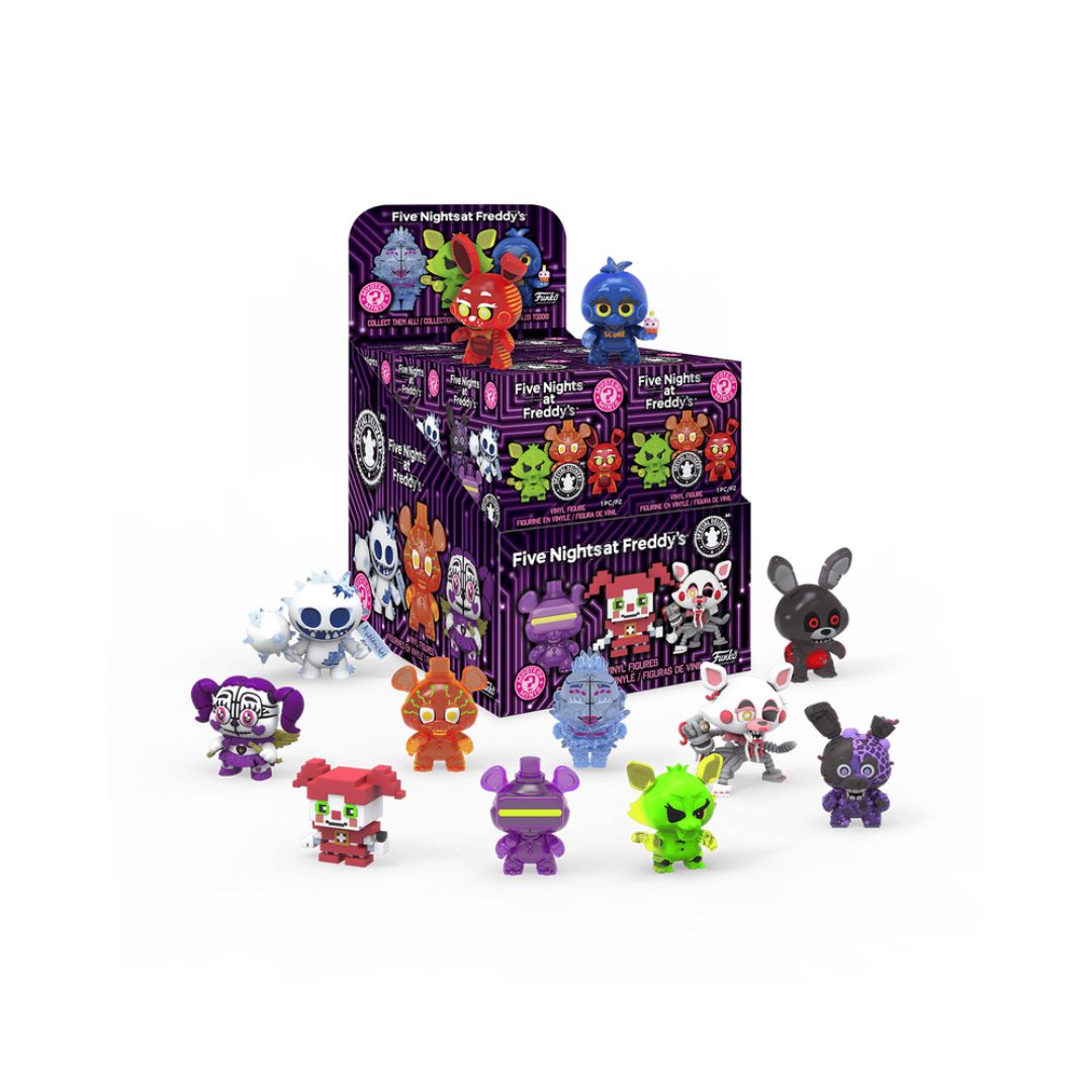 Five Nights at Freddy's: Special Delivery has unleashed terror upon your collection. Which figure will you unbox for your collection? There is Toy Freddy, High Score Chica, System Error Bonnie, Radioactive Foxy, Toxic Springtrap, 8-Bit Baby, Mangle, Frostbite balloon, Heartsick Baby, Black Heart Bonnie, Arctic Ballora, and Toy Freddy (Orange). Vinyl figures are maximum two-inches tall, which varies depending on figure. Please note: Item selection is random, as each piece is in blind packaging. We cannot accept requests for specific items. You may receive duplicate figures.