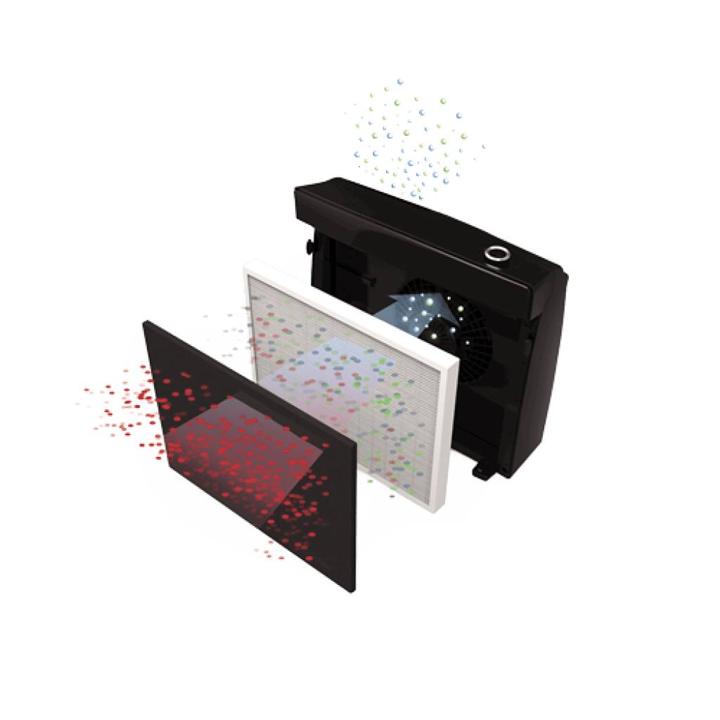 HEPA filter safely removes 99% of airborne particles as small as 0.3 microns, including pet dander, allergens, mold spores and dust particles