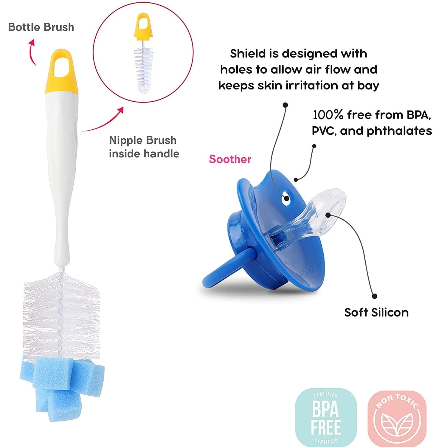The Disney Mickey Mouse Feeding Pack of 4 feeding bundles comes with 5 oz/150ml and 9 oz/250ml feeding bottles, a pacifier, and a feeding bottle cleaner. The iconic feeding bottle's classical shape of the feeding bottle helps the baby to have a good grip over the bottle and moms can comfortably hold them for a long time. These uniquely shaped are paired with venting technology. Expertly designed for easy assembly and leak-free feeding, the simple, one-piece integrated nipple and vent system means no extra parts to clean or lose. The unique shape, based on Disney’s flagship design with a lightweight, helps to make these bottles simple to hold, simple to use, and simple to love. The 100% soft silicone pacifier isn't just for pacifying but is also clinically developed for comfort, breathing, and orthodontic benefits. For baby’s comfort, the nipple is made from extra-soft silicone with a satin-textured finish to help keep the pacifier in the baby’s mouth for uninterrupted soothing. Plus, there's an easy-to-grab handle for either baby or parent to hold. The feeding bottle cleaner can easily bend to clean the insides of the bottle. Extra-long bottle brush, stainless steel wire bend does not break, Bristles can stretch or extrude steel wire easy to wash the shape. The handle is very comfortable and has good grips helping to easily get the cleaning done fast. Rest assured, our bottles, pacifiers, and bottle cleaners are 100% free of polycarbonates, PVC, and phthalates, and are also made of food-grade material.