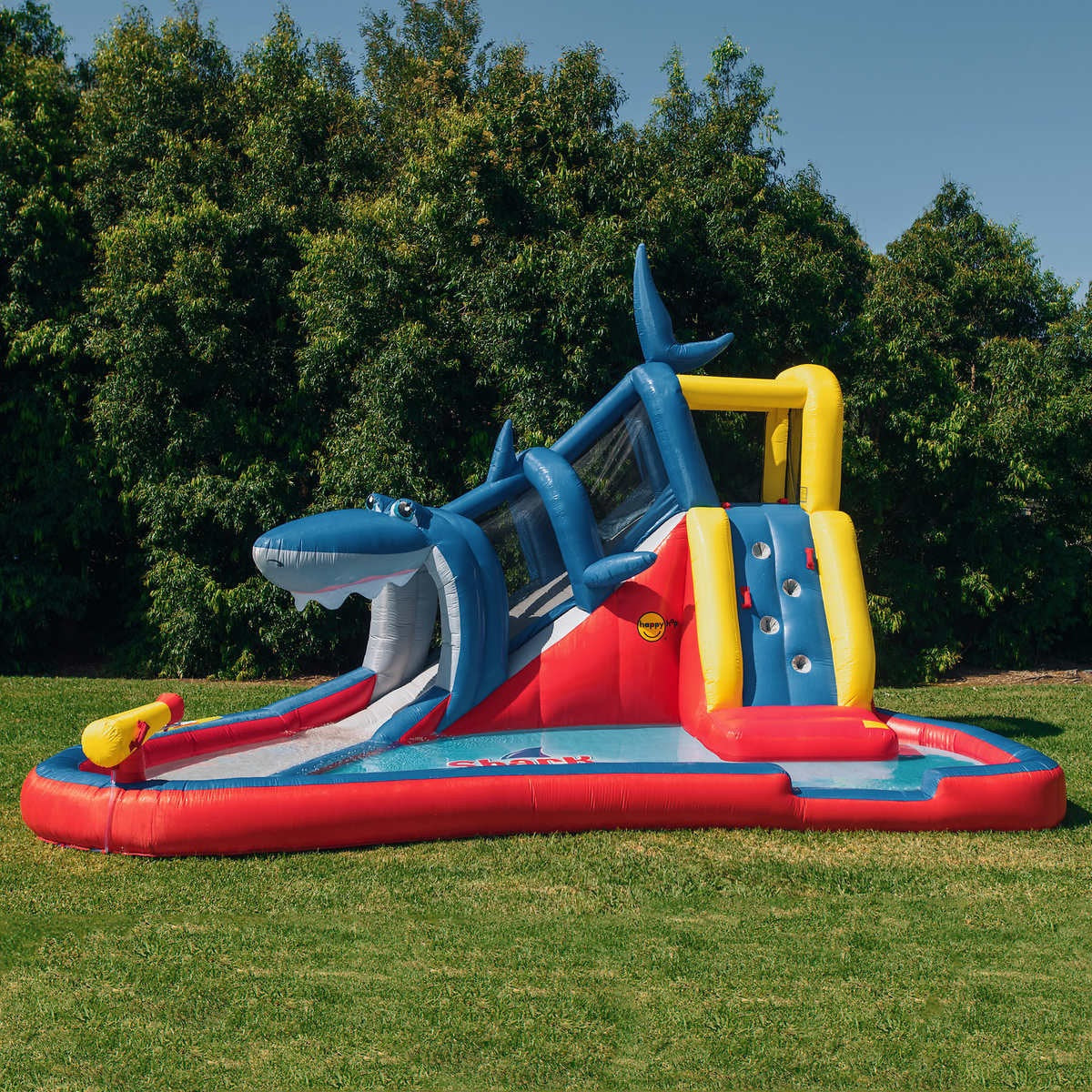 The Shark Cave Adventure Slide includes a large slide, a water cannon, a climbing wall, a tunnel, and a toss ring. This accommodates up to 3 kids and will be a showstopper at any birthday party or in any backyard.