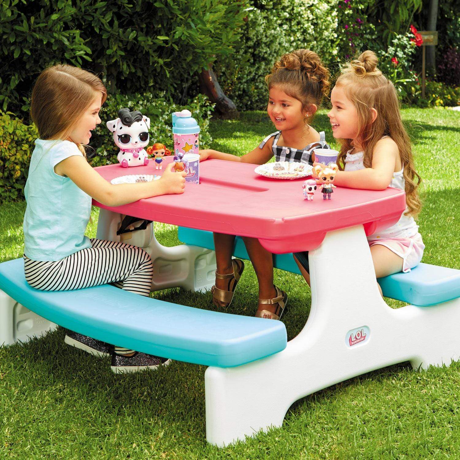 The LOL Surprise! easy store table with umbrella. It is a great space for art projects, games, and more! With its tool-free, easy assembly and easy-to-clean surface, It's a worry-free table that's great indoors or outdoors.