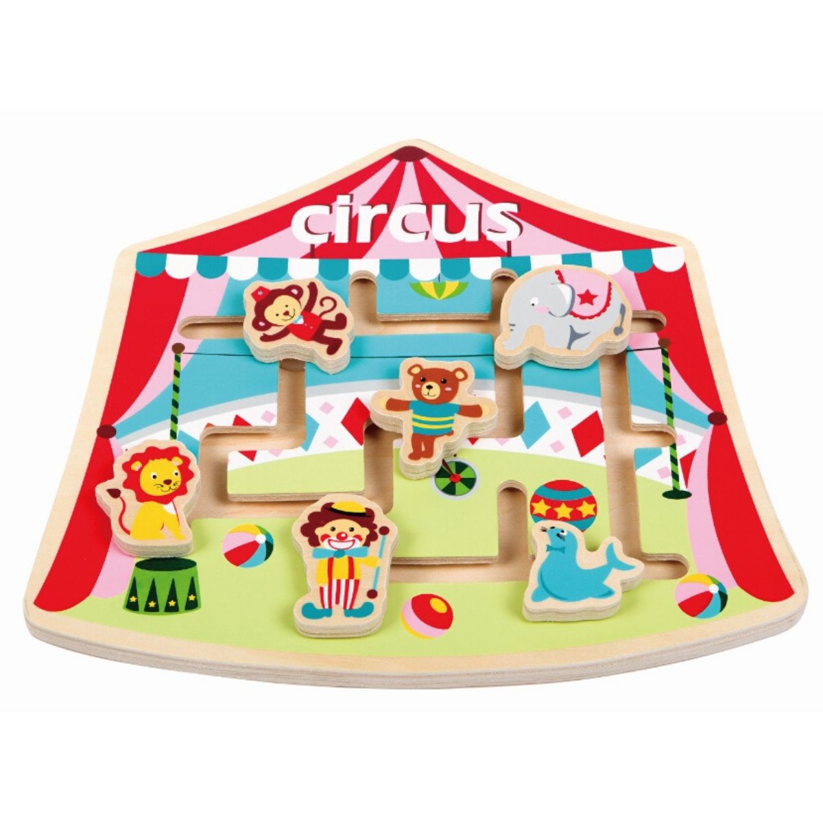 The Lelin Circus Pathfinder is an educational toy designed for young children to develop their motor skills, hand-eye coordination, and problem-solving abilities. The toy consists of a wooden frame with several colorful, movable pieces that can be manipulated along a track.