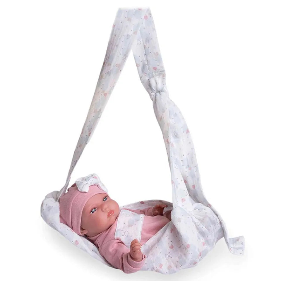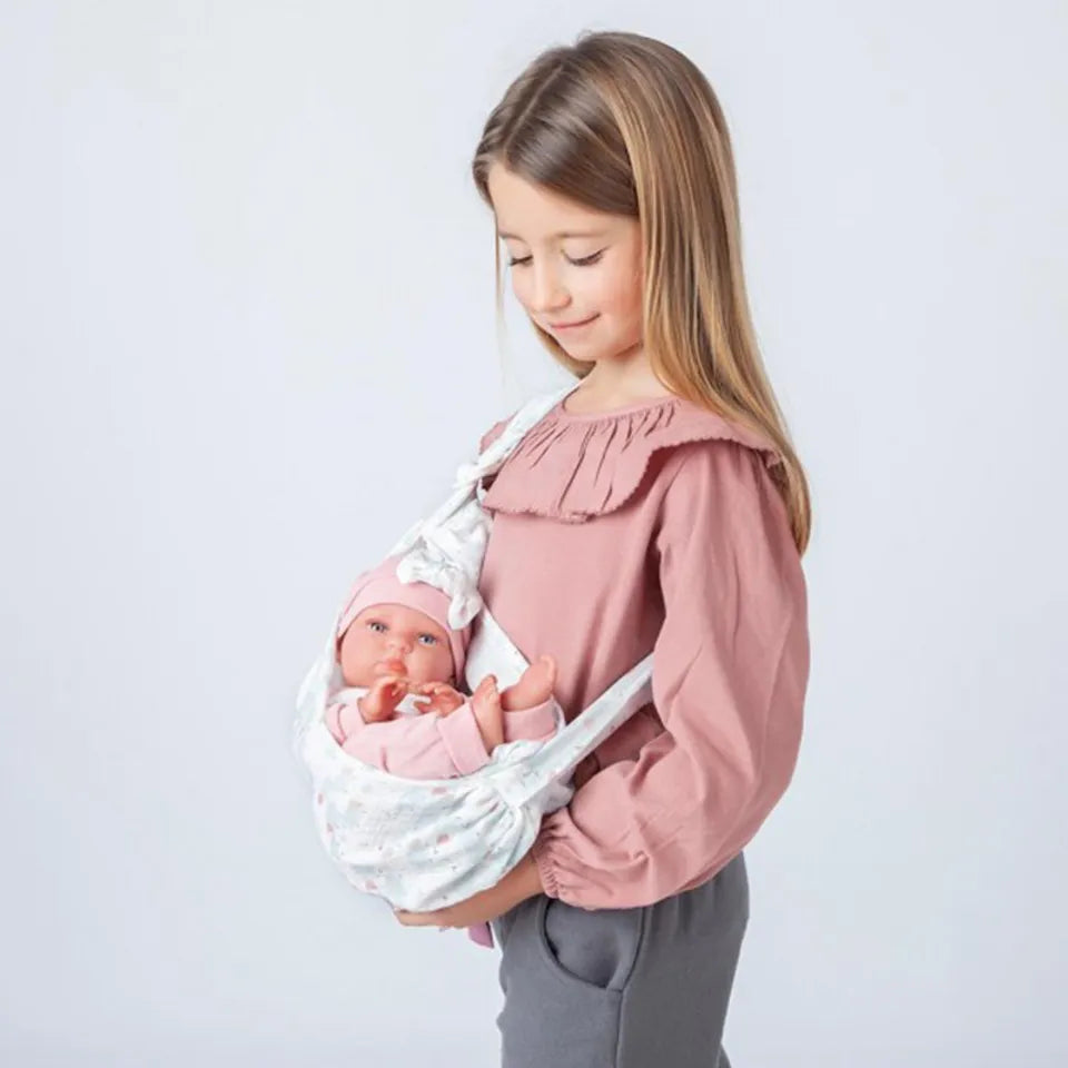 Introducing My Little Reborn Tufi Doll with Baby Sling, a delightful new addition to the Reborn family by Antonio Juan! Tufi is a playful little boy who loves to explore, and with his baby sling, he can go everywhere with you. Dressed in a charming pajama set featuring baby shower details, Tufi looks like a real baby. His limbs rotate, allowing for different poses and enhancing his realistic appeal. Weighing 685 g and measuring 33 cm, Tufi is perfect for children who enjoy taking care of and nurturing lifelike dolls. Included with Tufi are a pacifier with ribbon and a cozy baby carrier scarf, making him a wonderful companion for any adventure.