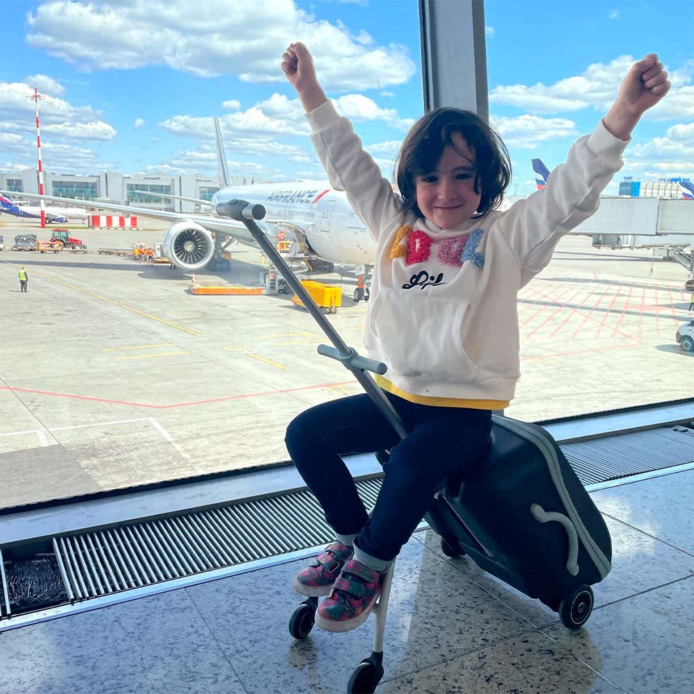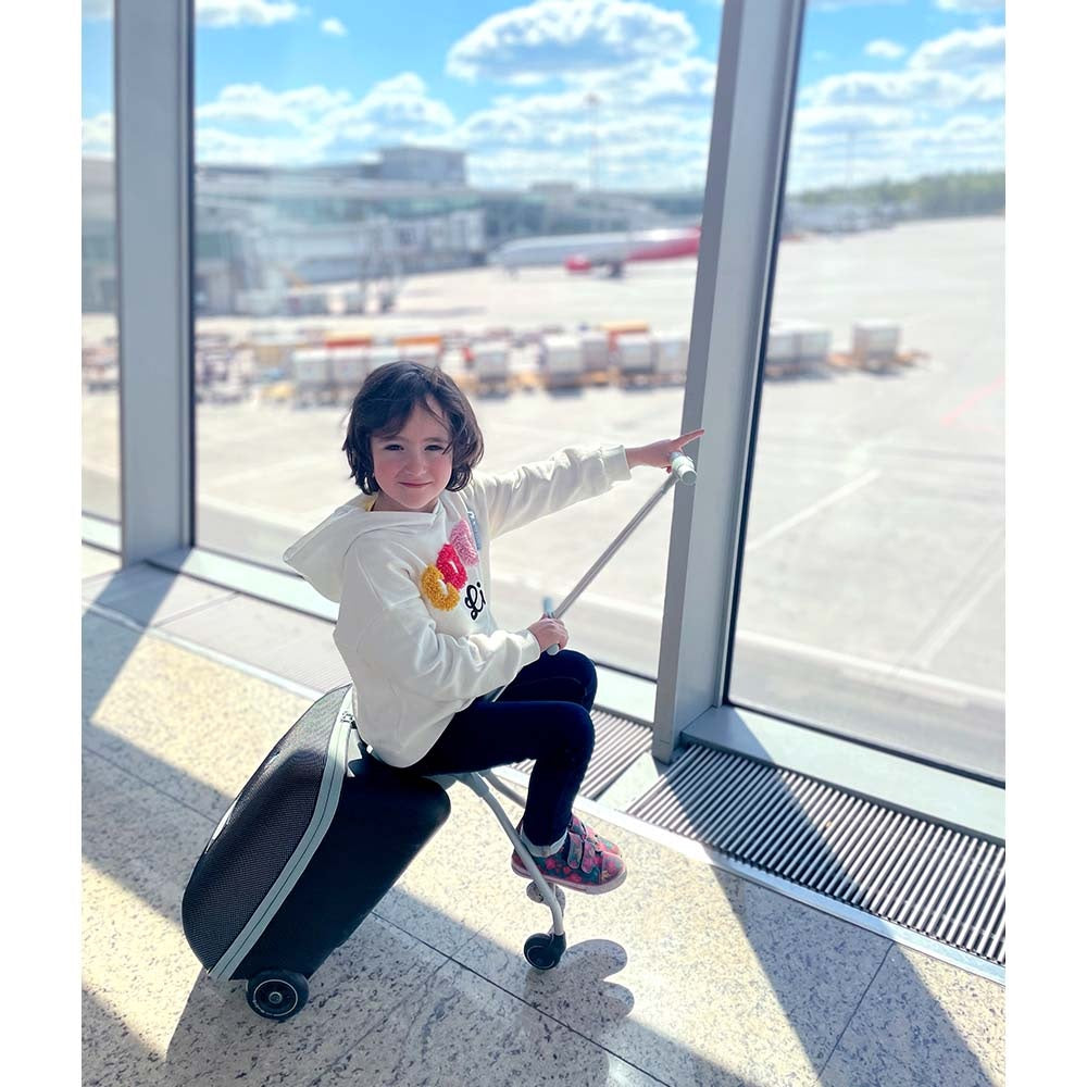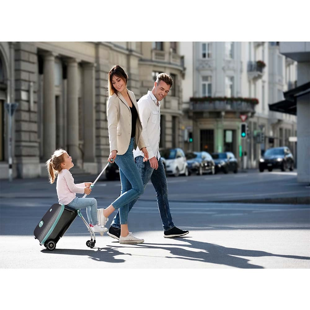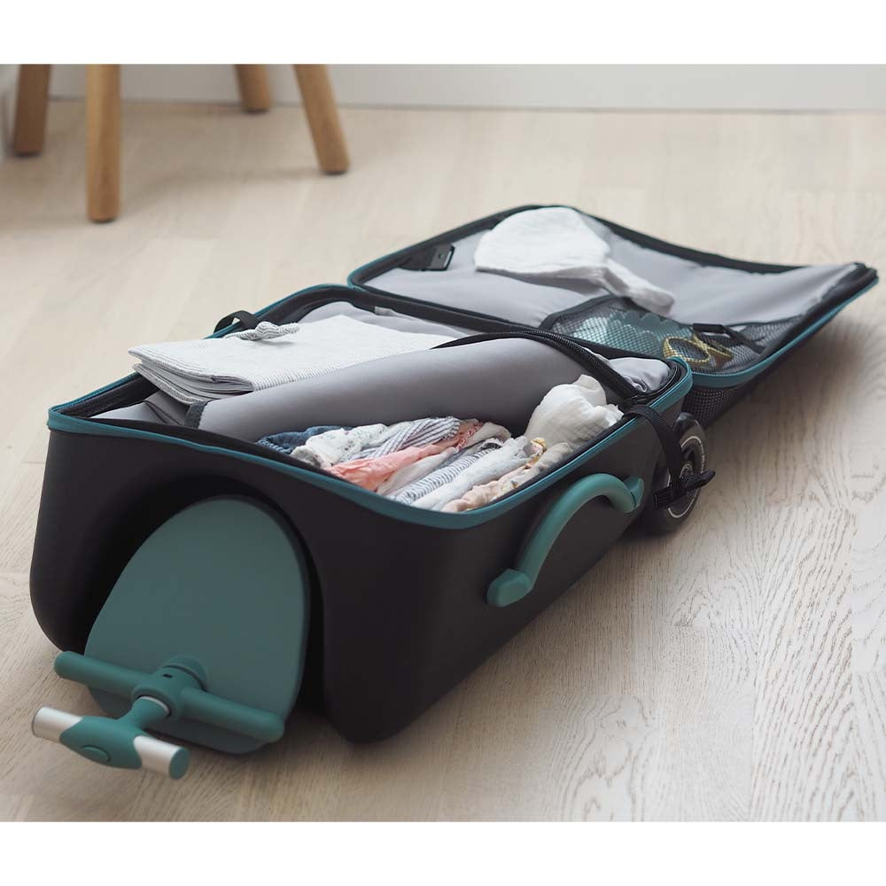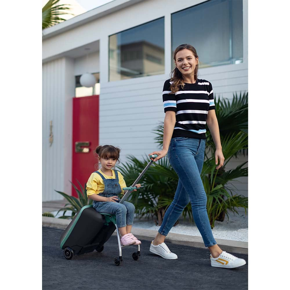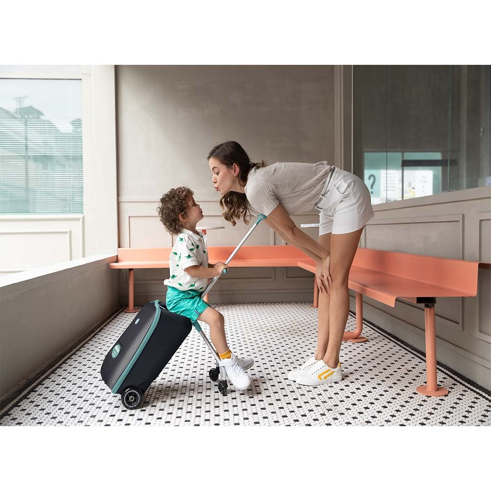 Beaba Eazy Luggage suitcase with integrated child seat. Cabin-approved ride-on suitcase. Seat also suitable for adults.