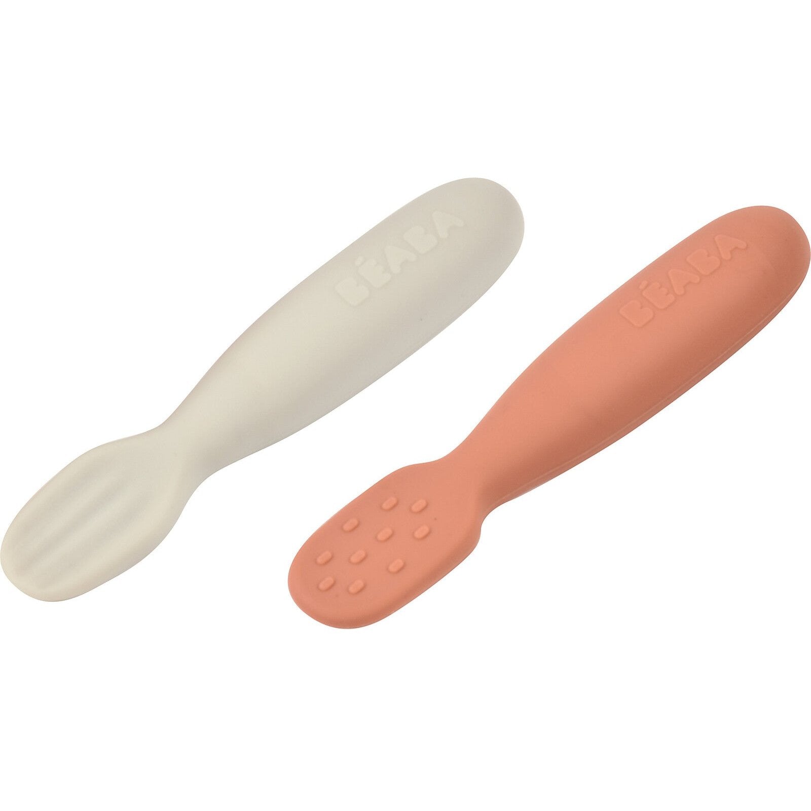 Set of 2 silicone pre-spoons with ergonomic shapes to encourage baby's feeding independence. Flat tips so that the spoon is not overfilled, can be used on both sides and does not require the wrist to be rotated. Flexible tips are specially designed to adapt to the child's needs. Use from 4 months, with an adult to familiarize them with the spoon and their first foods.