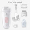 The Braun Silk-épil 5 offers a versatile 3-in-1 grooming solution, combining epilation, shaving, and precision trimming in one device. With 28 MicroGrip tweezers, it efficiently removes even the shortest hairs, providing up to 1 month of smooth skin. The device is designed for wet and dry use, making it perfect for use in the shower or bath. It includes a bikini trimmer, lady shaver, and trimmer comb for sensitive areas. The Smart Light helps ensure no hairs are missed, while the 40-minute cordless use provides uninterrupted grooming sessions.