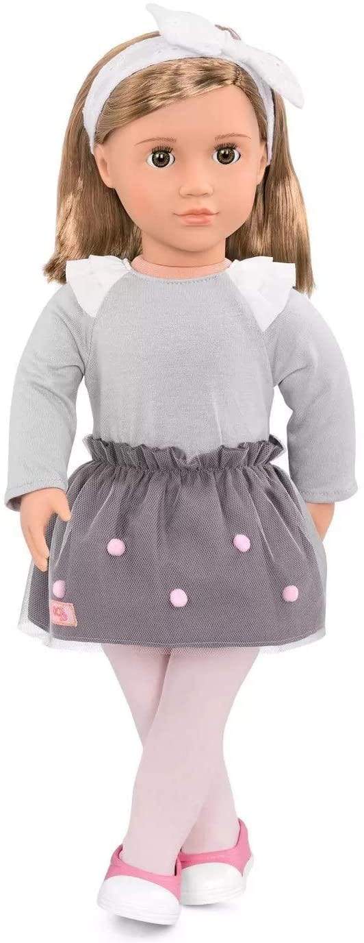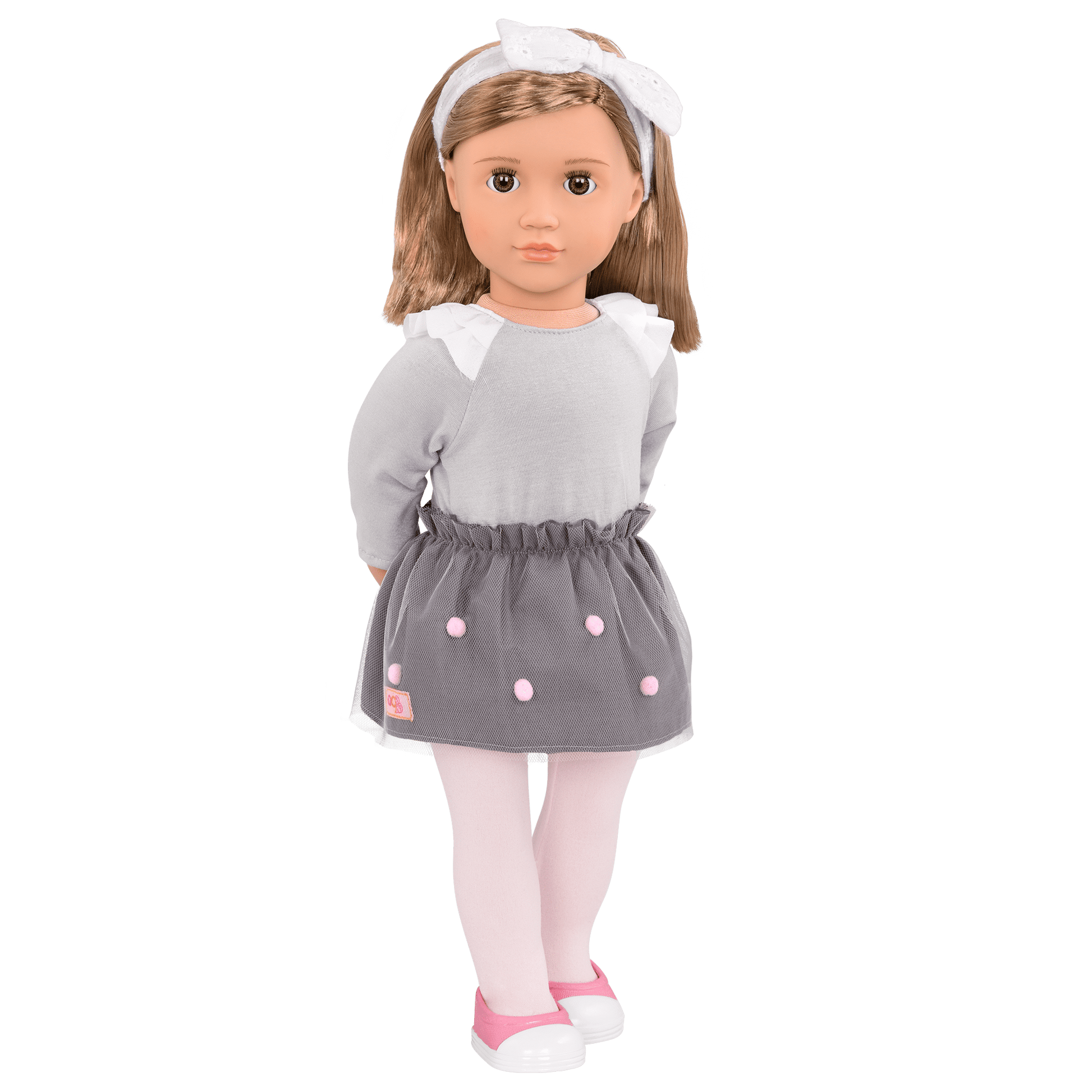 Bina has pretty, pale green eyes and light brown, shoulder-length hair that’s fun to comb and style! She arrives wearing a casual outfit that features a light gray, long-sleeved sweater with a ruffle shoulder design, a veiled, dark gray skirt with pink pom poms, tights, stylish shoes, and a beautiful white headband that ties her outfit together. She really hopes you like her ensemble; it was picked out just for you!