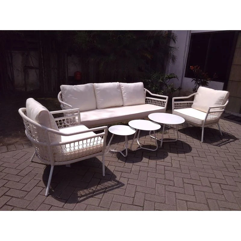 Sofa Material: Powder-coated aluminum frame covered in rope fiber, with cushions made of synthetic fiber to endure all weather conditions.