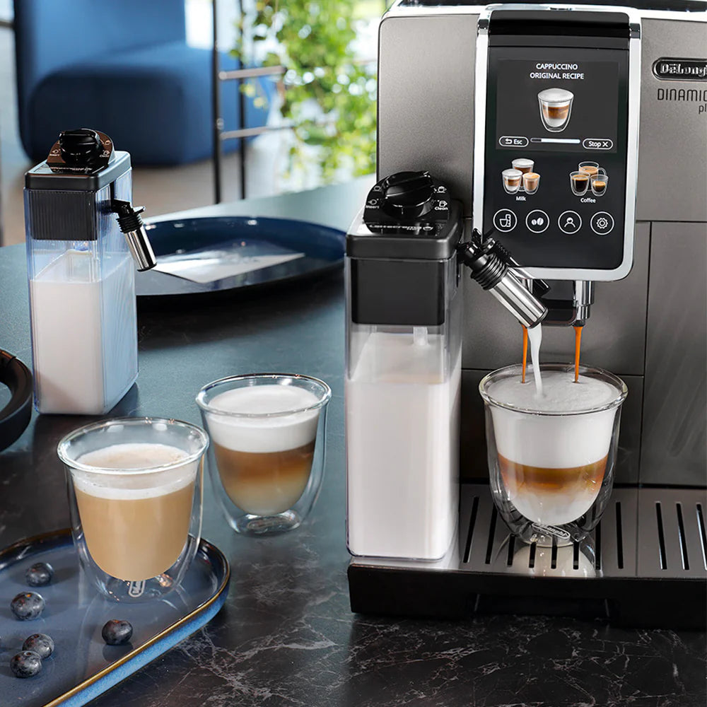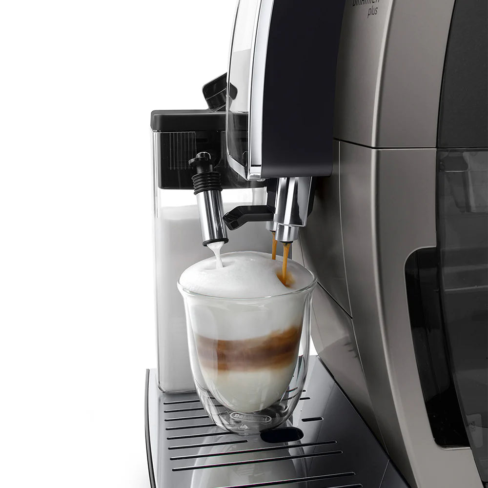 There’s a coffee for every moment of the day with Dinamica Plus. Choose from 24 drinks available in one touch through the intuitive 3.5" full-touch colour display. Equipped with exclusive LatteCrema Hot technology to top your drinks with fine rich milk foam, with the possibility to select from 3 foam textures: dense, creamy or light,LatteCrema Hot tops your drinks with fine rich milk foam. Choose from 3 textures: dense, creamy or light, Coffee classics tailored to you with up to 4 user profiles,Stylish coffee machine with a titanium painted front.
