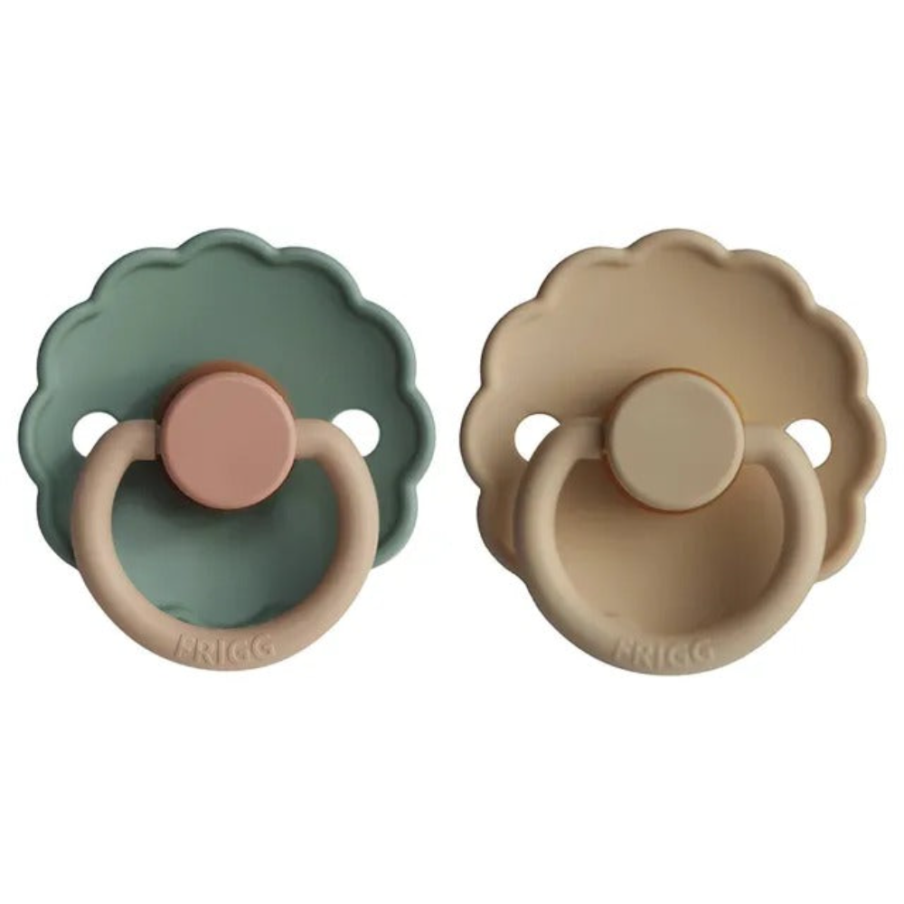 The FRIGG Daisy pacifier with scalloped edges that mimic flower petals is the essence of elegant design. The flowery and modern details catch the eye of every style-conscious mother. That makes FRIGG the perfect fit for today's mothers who attach great importance to classic designs with modern twists when choosing baby essentials. , , FRIGG Daisy is available in two sizes: , Size 1: Nipple is 27 mm and is recommended for ages 0-6 months. , Size 2: Nipple is 30 mm and is recommended for ages 6-18 months.