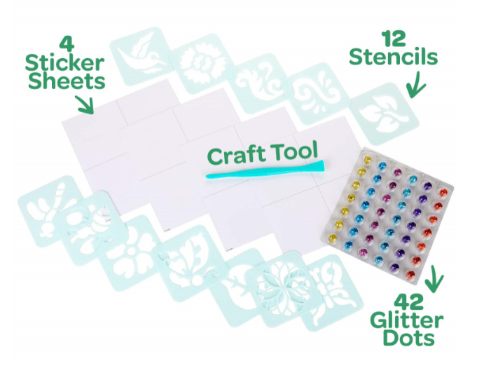 Crayola Glitter Dots offer fun glitter play in a less messy way! Press and spread glitter dots through the stencils, onto the sticker paper. Peel your dazzling design then proudly stick & display! Comes with 42 Glitter Dots, 12 Plastic Stencils, 4 Sticker Sheets, and 1 Craft Tool.