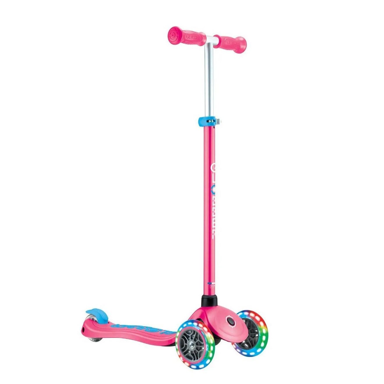 Globber - Primo Plus Lights Three Wheel Scooter, Adjustable T-Bar, Patented Steering Lock System, Light Up Wheels, 3 Years+, 58 x 28 x 76 cm - Fuchsia