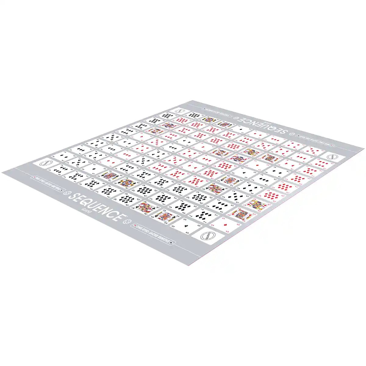 Number of players: 2 to 12 players Age: From 7 years old Playing time: Ca 20 minutes Sequence on a giant play mat of about 70 x 80 cm in a convenient carrying and storage socket. Play on the table, but especially on the floor, on the campsite or in the garden. The large mat can withstand a punch and is very large, so you can see from your comfort where you disturb your fellow players. The sequence is the international classic, of which millions were sold. You play cards so you can put chips on a game board. The intention is to form lines on the board with the tokens you have laid. You can bother yourself with Sequence by putting a record right there, where another player thought he could form a line. In the Tube you will find a huge playing mat, 135 chips in 3 colors, 110 playing cards and the rules of the game of course. Sequence you play like this: With two or three players you play individually; with more players you play in teams. Teammates are not sitting next to one All players receive a number Each card is also represented 2 x on the game board. In turn, you play a card and you can put a card of your color on one of the corresponding boxes. You need to try to form a row on the board with your chips. Lines of 5 tokens. So look carefully what of the two boxes on the board you put your card. Where can you form a line? Where can you disturb your fellow players? Fortunately, there are also wildcards and bullying cards. Sequence Jumbo Tube: Up to 12 comfortable players around a giant mat!