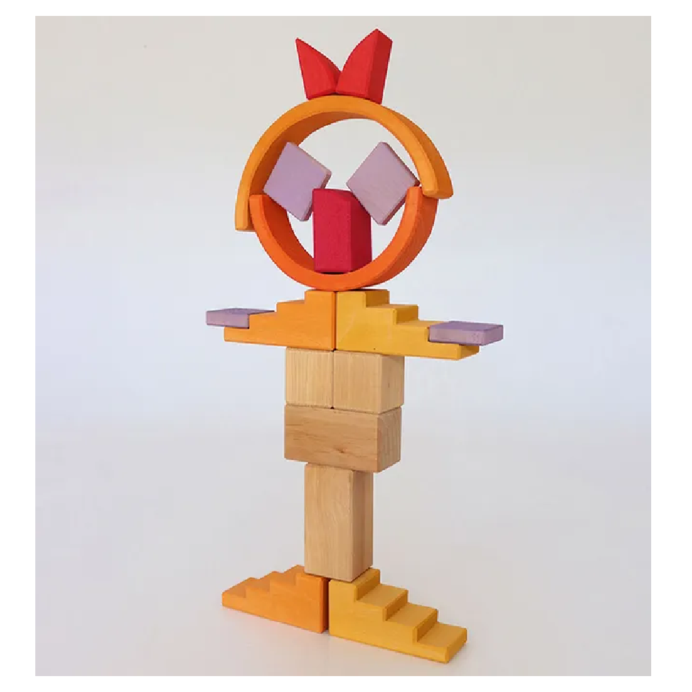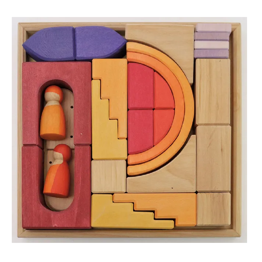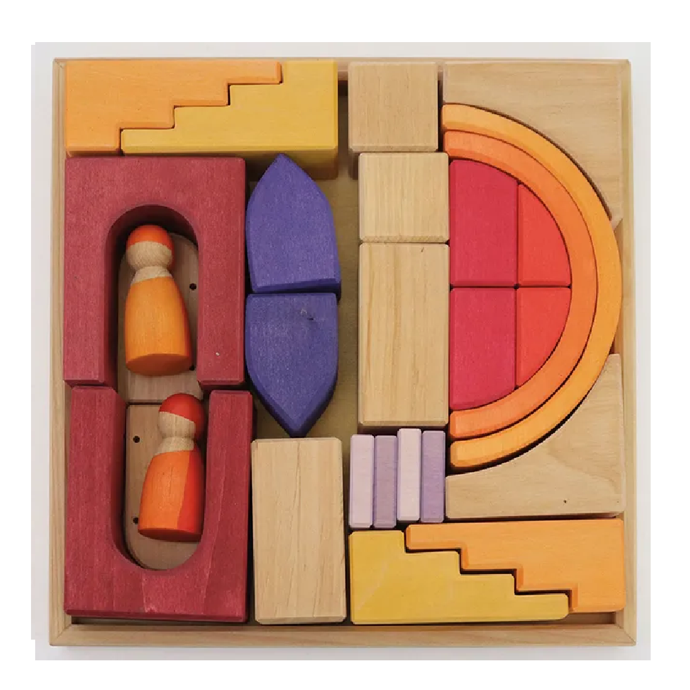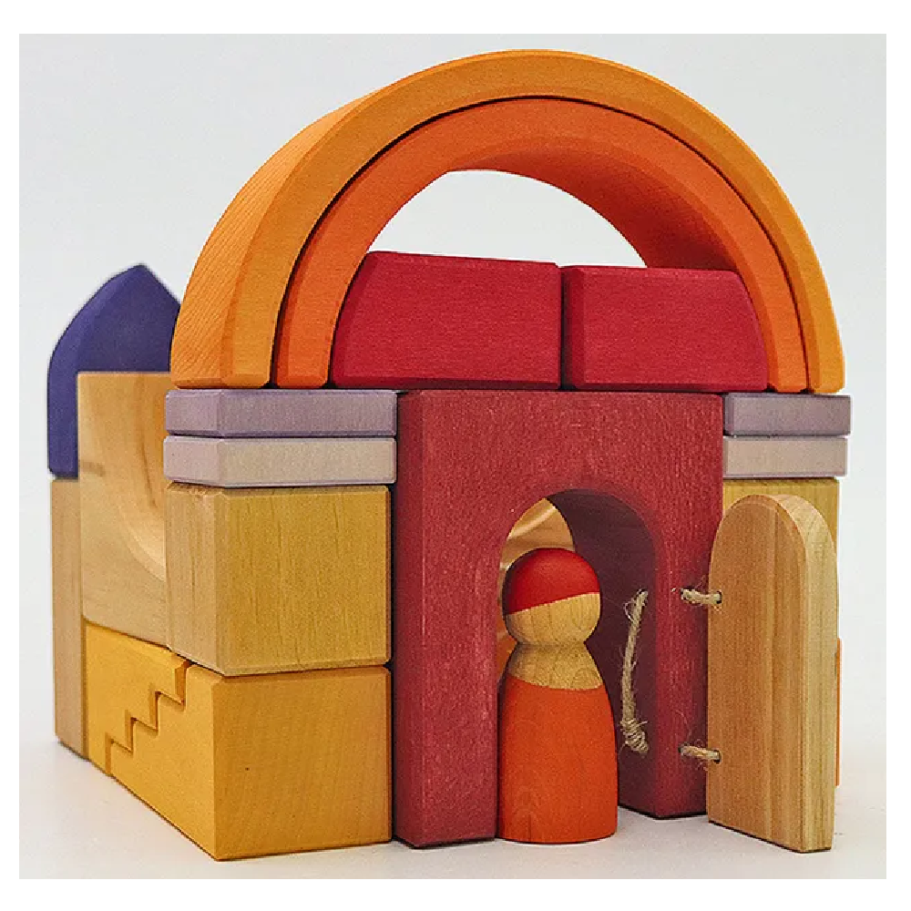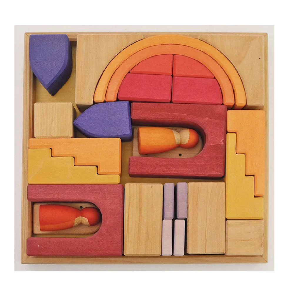 Rich yellow, orange and red tones mixed with natural wood give the Building World Desert Sand a deep warmth. The building materials come in a wide variety of shapes allowing imaginative free building and will complement the GRIMM'S assortment with their wonderful details, such as the special robes of the two friends and a mountable, movable door. Our Building Worlds come in a handy frame and are just waiting to burst it with the imagination of a child.