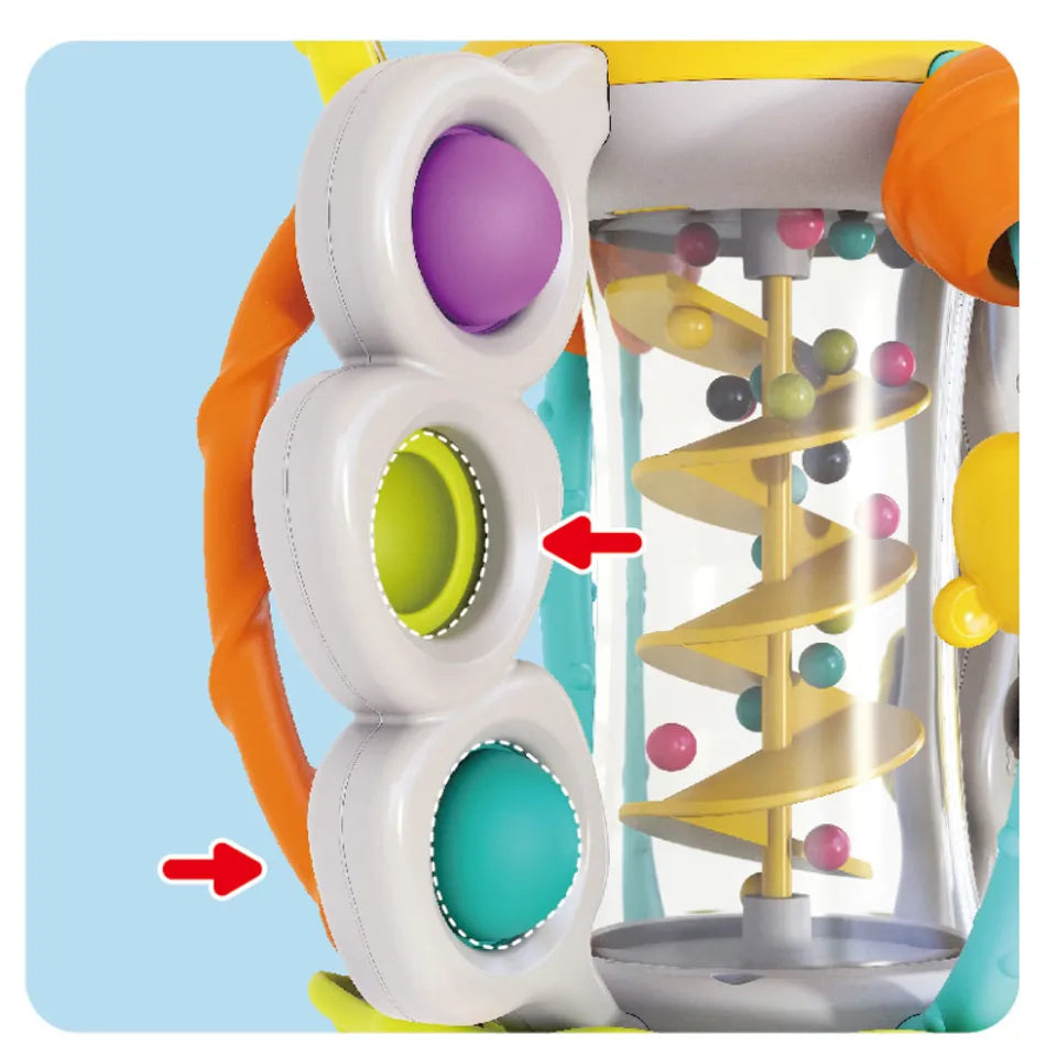 Introducing the Hola Shake & Pull Busy Ball, the ultimate toy for children aged 6 months and up! This interactive toy features 4 engaging games that help develop fine motor skills through pressing, sliding, pulling and shaking. With activities like bubble popping, a transparent tube with moving beads, a fun spinning top, and an easy-to-grasp design, this toy is perfect for developing fine motor skills, hand-eye coordination, sensory perception, and colour recognition in young children. Keep your little one entertained and engaged with the Hola Shake & Pull Busy Ball!
