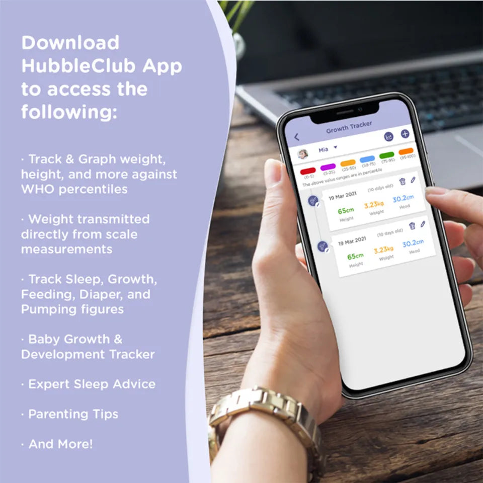 The Hubble Grow Smart Baby Scale & Changing Pad has made it simpler than ever to track your baby's development. Its ergonomic design makes it easier and more comfortable to weigh your baby. Never miss a moment of growth by saving data in a seamless step, using Bluetooth on the baby tracker, available with the HubbleClub App. It also includes a soft, washable, hypoallergenic cover that can be used as a diaper changing pad. The lightweight design of the Hubble Grow Smart Baby Scale makes it easy to move around the house during your busy days. The 4-sensor technology provides optimal accuracy, while the lightweight design makes displayed on a large LCD screen. The scale holds up to 44 lbs and provides seamless transitions between metric and standard units. Never worry for a second about the healthy growth of your baby with the Hubble Grow Smart Baby Scale & Pad, an essential part of Hubble Connected new Health line.
