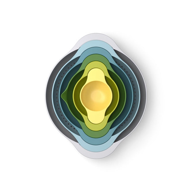This Joseph Joseph Duo 6-Piece Food Preparation Bowl Set is a compact solution for efficient kitchen storage. It includes mixing and preparation bowls in different sizes and a colander, providing comprehensive tools for your food preparation and baking needs. The bowls stack together in a nested style to fit effortlessly into your kitchen cupboard.