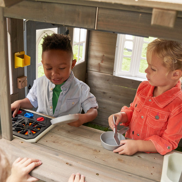 The Forestview II Playhouse by KidKraft is built to spark imaginative play in a beautiful house packed with fun and exciting possibilities. Kids will love playing outside for hours in this house full of realistic and exciting details like a working doorbell, a clock with moveable hands and double-sided chalkboard walls. Little ones will light up as they walk through the front door and enter the playhouse with decorative windows to see that there is an adorable play kitchen complete with two pans and a spatula hanging on cute little pegs. Featuring a large serving window with a moveable bench and two planter boxes, the Forestview II Playhouse by KidKraft creates the ultimate fun destination for kids. Built with premium wood and treated with a child-friendly water-based stain, the Forestview II Playhouse by KidKraft is made with high-quality materials and designed to be aesthetically pleasing so little ones can have big fun in their backyard for years to come. With EZ Kraft Assembly™, spend less time assembling and enjoy more time playing!
