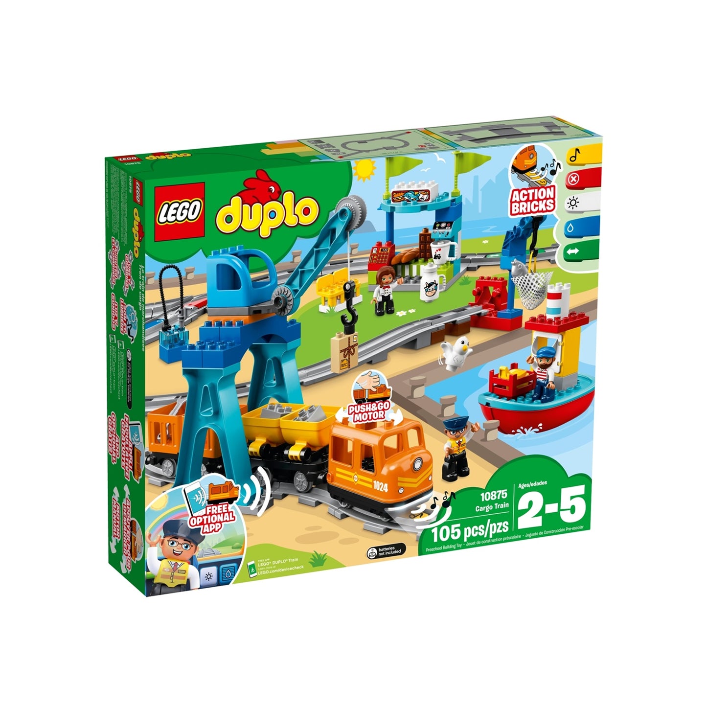 - Features a buildable Push & Go locomotive with lights and sounds, 2 cargo trucks with tipping function, 5 color-coded action bricks, harbor area with small crane and boat, large crane, café, loading/unloading station and 24 pieces of track including switches, hills, a crossing and stops.