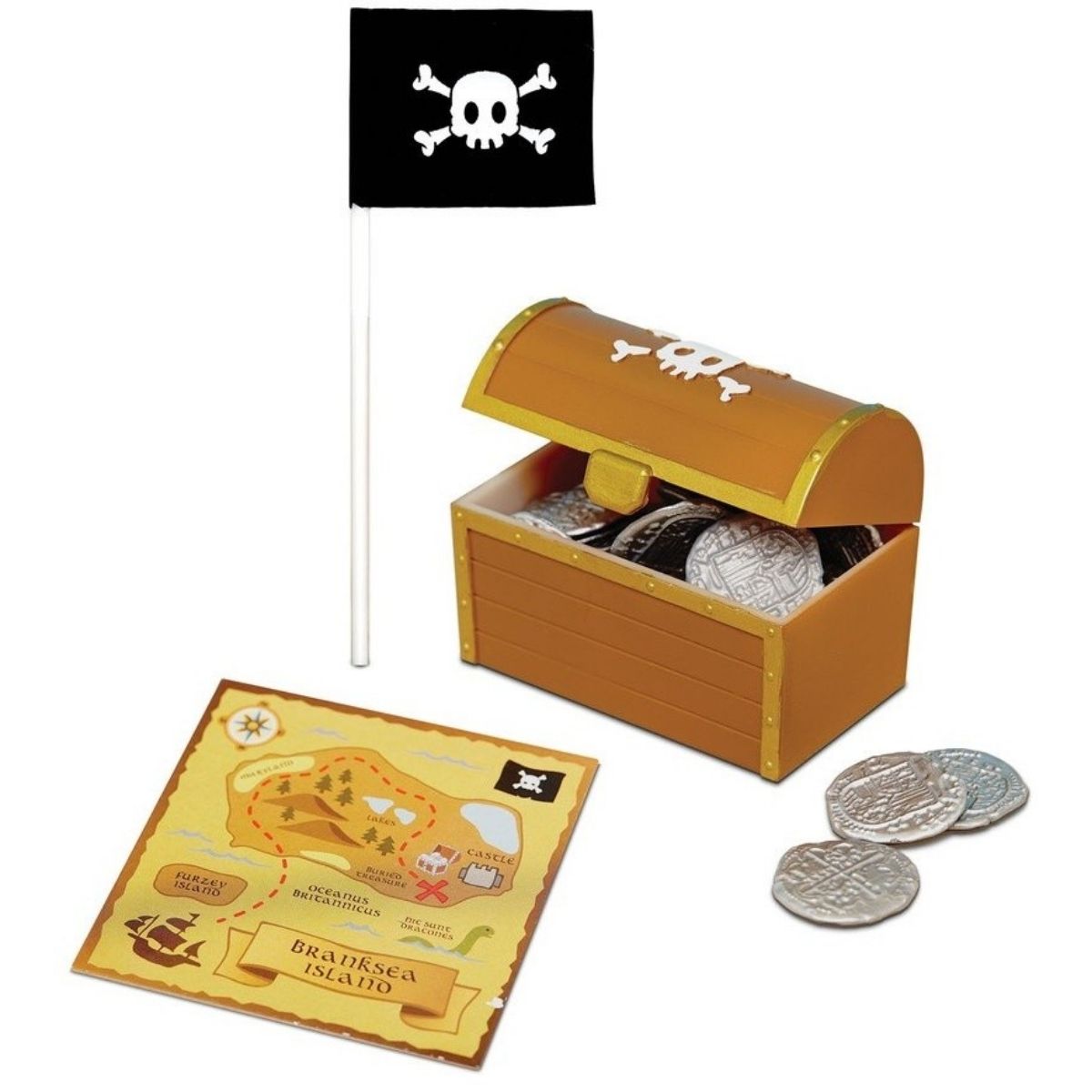 The set includes various accessories, including a pirate flag, a treasure hunt map, silver coins, and a treasure box, that can be mixed and matched with other Lottie dolls and outfits to create unique play scenarios.