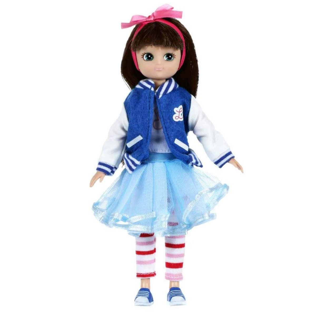 Lottie Rockabilly Doll is a fun and funky doll with a retro vibe. She has long hair, and bright blue eyes, and is dressed in a vintage-inspired outfit that includes a Varsity jacket featuring the ‘Be Bold Be Brave Be You’ print on the back, a long-sleeved t-shirt, a fun tutu skirt, sneakers, and striped leggings. Lottie also comes with accessories like cat-eye sunglasses and a hair bow to complete her retro look.