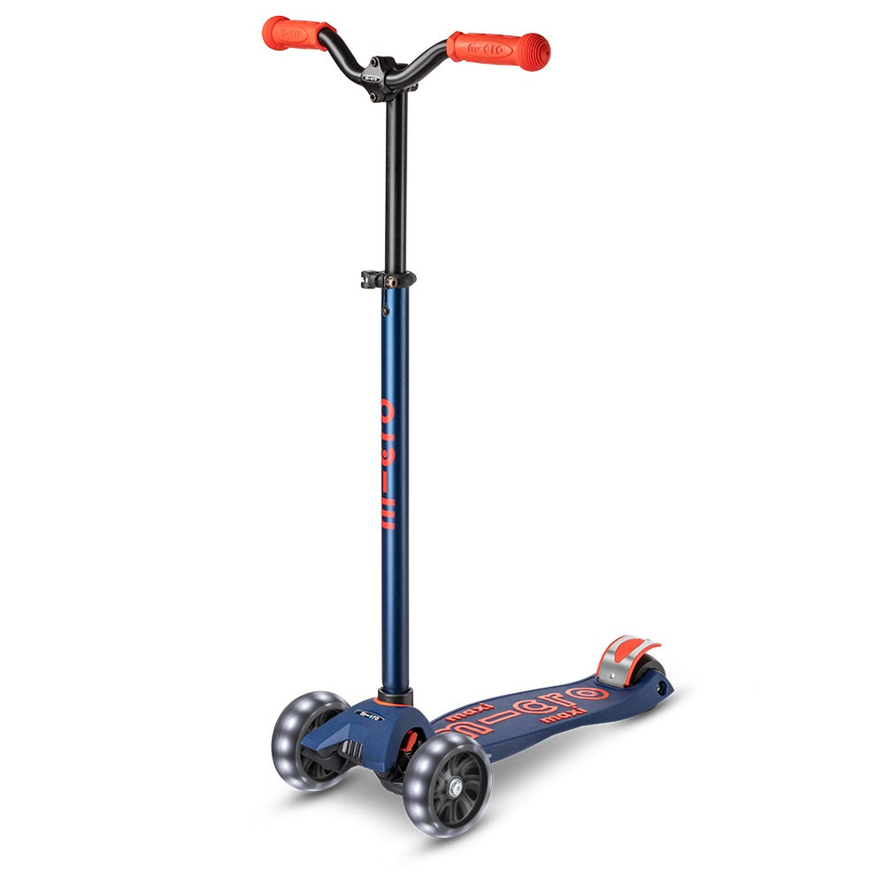 The wide LED front wheels and the cool chopper handlebar make the Maxi Micro Deluxe Pro LED a real eye-catcher. Besides the unique look, the kickboard scores are high-quality and have practical features. Weight-shifting steering gives a distinctive riding experience and at the same time promotes balance and motor skills. The silicone moldings on the reinforced footplate provide more grip and the two reflectors next to the rear wheel ensure better visibility. Thanks to the height-adjustable handlebar, the Maxi Micro Deluxe Pro LED grows with the child and will be a long-time companion.