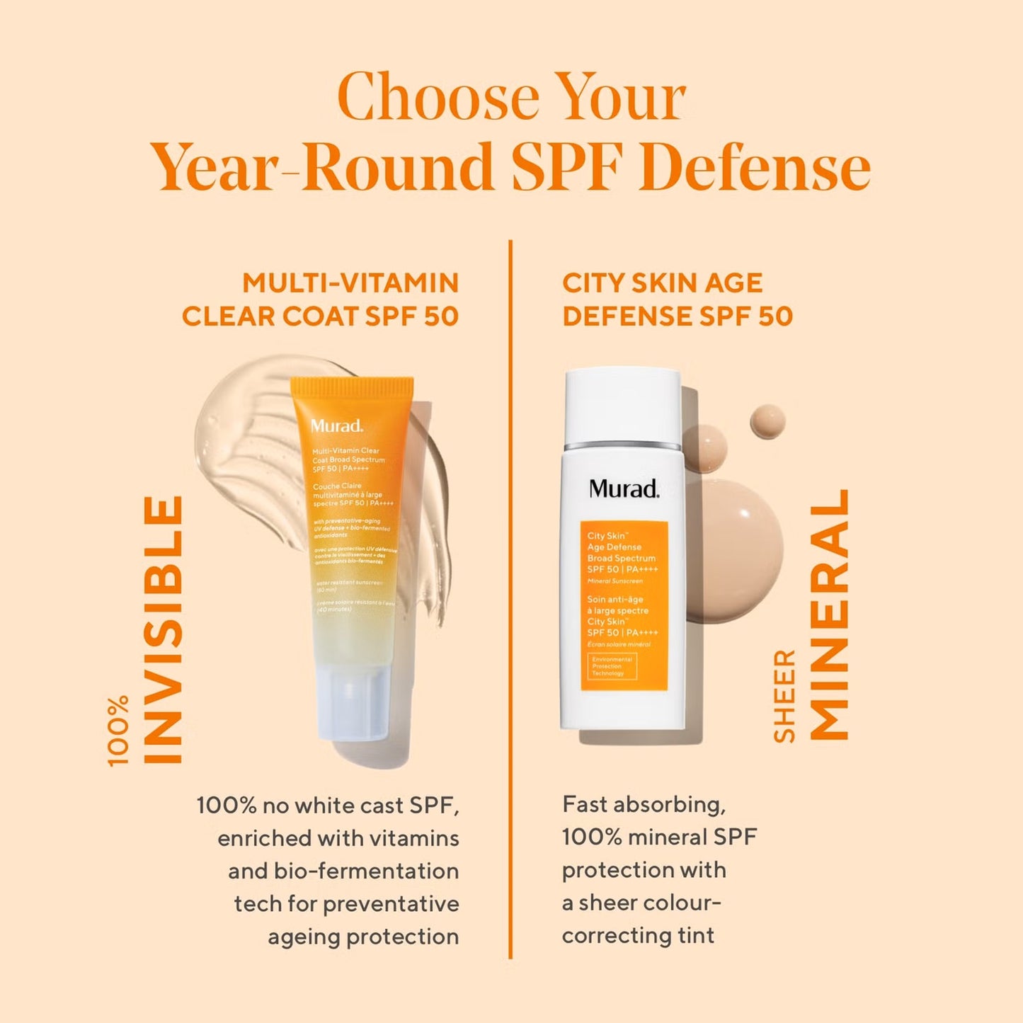 Fusing SPF50 protection and multi-vitamin care, the exclusive Murad Multi-Vitamin Clear Coat SPF offers sun protection, skincare, and antioxidant benefits for all skin types and tones. The revolutionary clear formula allows your skin colour to shine through – no white cast in sight.