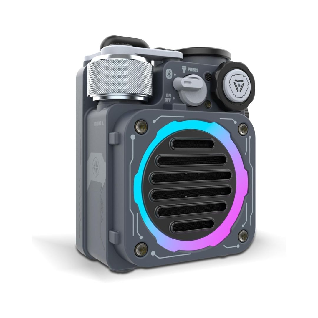 Experience the ultimate fusion of style and technology with the Futuristic Metal Speaker. Inspired by space and cyberpunk themes, its sleek design delivers a mesmerizing party atmosphere with an RGB LED light show synchronized to the music’s bass levels. Despite its compact size, enjoy powerful sound and clear tones, thanks to tuned DSP and metal cavity construction. Built tough with IPX5 waterproof and dustproof ratings, it’s perfect for indoor and outdoor use. Portable and lightweight, it features a versatile built-in flashlight and Bluetooth 5.0 connectivity for seamless streaming. With a 1000mAh battery, enjoy up to 8 hours of playtime, ensuring uninterrupted entertainment on the go.