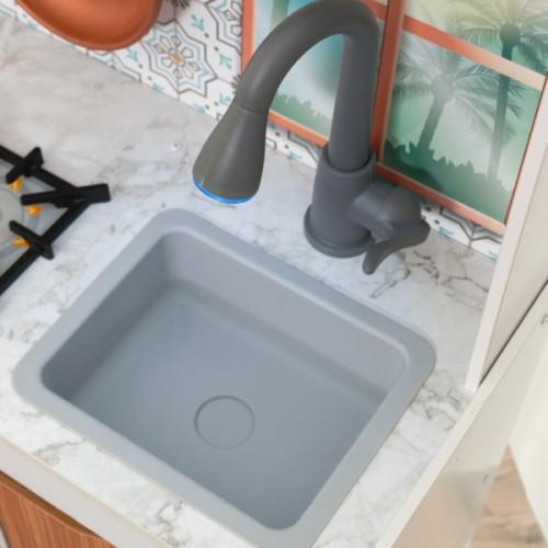 It's time to cook in style! The KidKraft Taverna Play Kitchen is streamlined and stylish, ready to inspire pretend meals of extreme creativity. The mod marble-Esque countertops house two burners, a sink and a faucet with lights and sounds. The lovely backsplash is the perfect backdrop to showcase the included spatula and pan on hooks. Above, store all your dishware in the slots and sliding-door storage area. We've even provided a couple of plates to start the collection. Need more storage? Simply hinge open the convenient side panel and voila! —hidden shelving! An ice maker with pretends ice cubes also provides extra interactive entertainment. Personalize this cute kitchen with the chalkboard sign. Every kid will love to call the Taverna Play Kitchen their own.