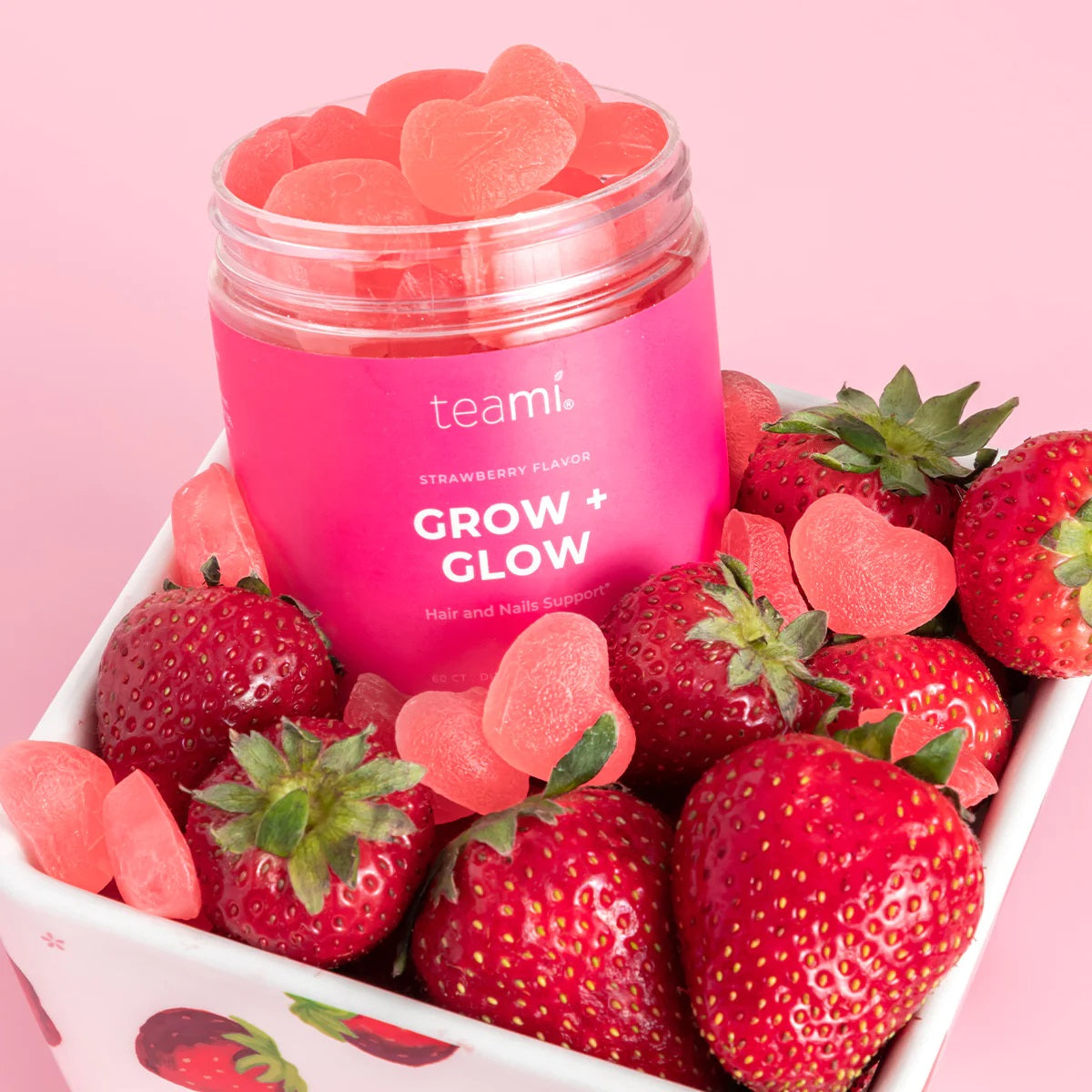 Support your natural hair and nails with Teami Grow + Glow Gummy. Formulated with the best hair and nail-loving ingredient combo of Biotin, Folic Acid, Vitamin B12, and Vitamin B6 to support your beauty journey from the inside out. Teami's strawberry-flavored Grow + Glow gummies are soft, delicious, vegan, sugar-free, and the perfect way to support strong hair and nails daily.