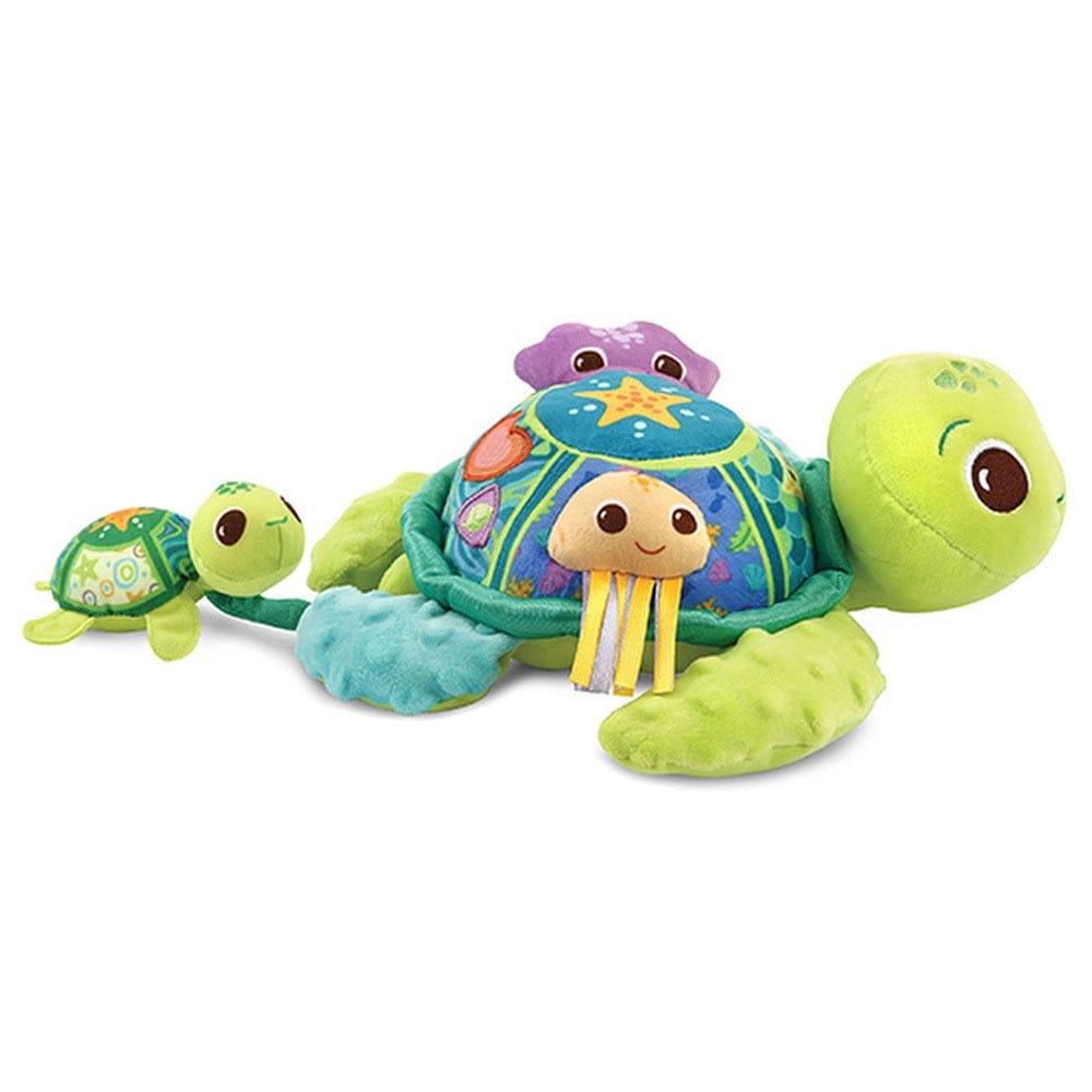 Pull the baby turtle out and watch it wiggle back to the big turtle! Press the soft fabric buttons for early learning content, sounds, and melodies. Peekaboo mirror and ribbons for self-discovery and tactile stimulation.