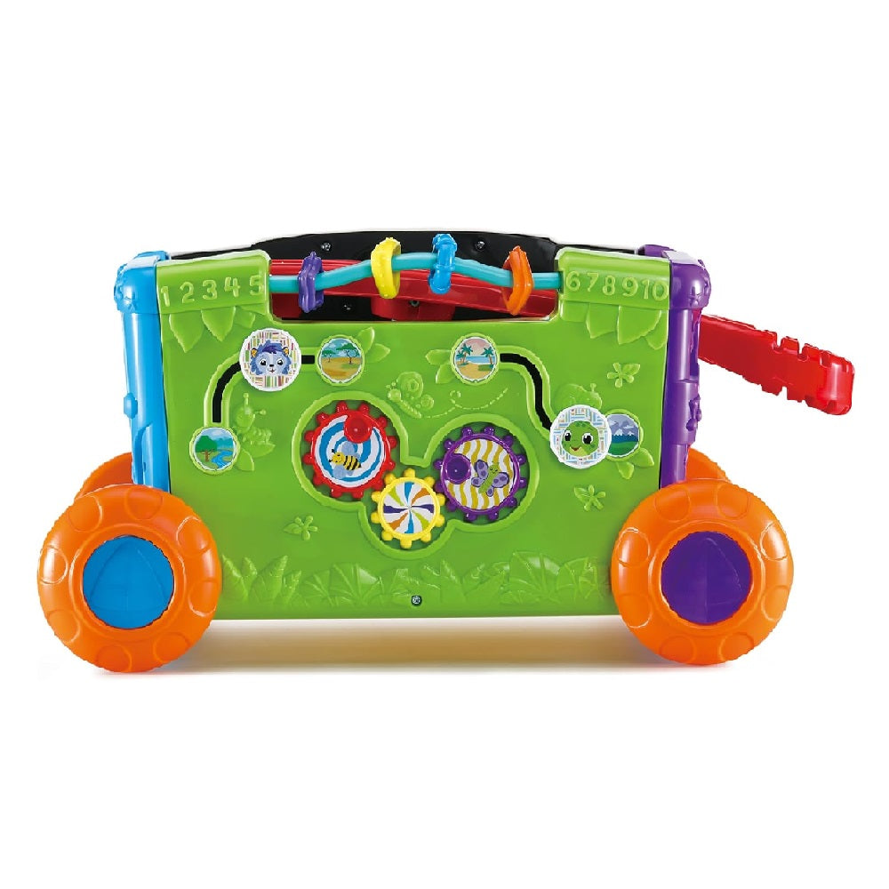 • Interactive activity wagon with shape sorters, buttons, and animal figures